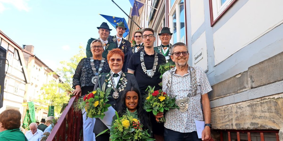 Für die Schützinnen und Schützen startete das Programm nicht erst mit dem Festumzug, sondern schon vorher mit dem Schäffertrunk und den Siegerehrungen am Rathaus. Um 13.30 Uhr auf den Punkt genau wurde dann auf der Rathaustreppe das gut gehütete Geheimnis gelüftet, wer die Königsehren errungen hat – auch Bürgermeisterin Heike Brennecke gratulierte.