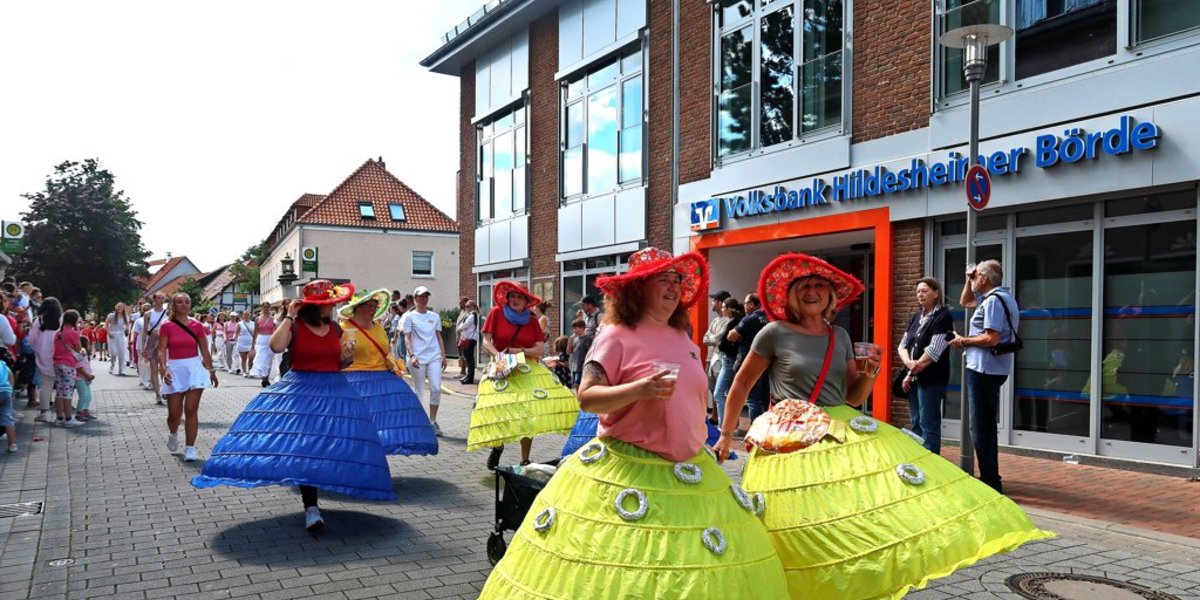 Sarstedt - Zuerst ist nur von fern der Rhythmus der Musikzüge zu hören, dann nähert sich der Festumzug. 46 Gruppen nehmen teil und haben den Zuschauerinnen und Zuschauern einges zu bieten. Das Publikum hat sich bei blauem Himmel und Sonnenschein schon frühzeitig eingefunden und säumt die Straßen. Manche machen es sich beim Warten auf den Bordsteinkanten leidlich bequem, jemand hat Bank und Sonnenschirm herausgeholt, eine Gruppe sammelt sich um einen Stehtisch und hat schon mal mit Sekt angestoßen. Aus dem Seniorenheim Heilig Geist ist eine Gruppe Senioren dabei, die Rollstühle nebeneinander aufgereiht.