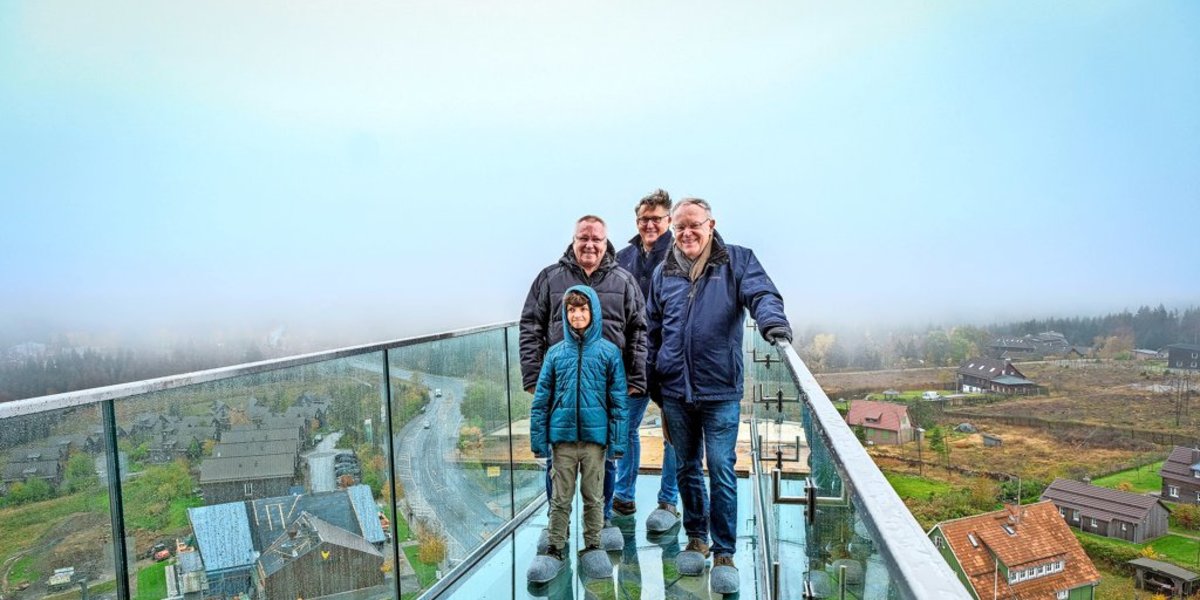 Ob Weil den Mut aufgebracht und das ganze tatsächlich genossen hätte, bleibt offen: Die Rutsche als eine Zusatzattraktion des neuen Tourismus-Highlights in Torfhaus ist nämlich noch nicht freigegeben. Das schlechte Wetter der vergangenen Tage habe notwendige Schweißarbeiten unmöglich gemacht, erklärt Hannes Maringer, Geschäftsführer der Turm-Betreibergesellschaft. Was ebenfalls zunächst noch nicht in Betrieb ist: der Aufzug. So bleibt den Premierengästen am Mittwoch und ab Donnerstag für wohl noch einige Wochen auch allen zahlenden Besucherinnen und Besuchern nur ein Weg nach oben: der über die 304 Treppenstufen. In luftiger Höhe lässt sich dann der sogenannte Skywalk betreten; eine nach außen ragende Plattform mit gläsernem Boden, für den man besser schwindel- und höhenangstfrei sein sollte. Die Aussicht ist an diesem Tag allerdings getrübt: tief hängende Wolken, heftige Windböen und Nieselregen vermiesen die Premiere etwas.