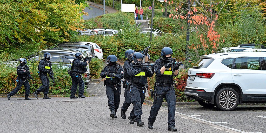 Detfurth - Eine Gruppe Polizeibeamter stürmt mit Maschinengewehren im Anschlag am späten…
