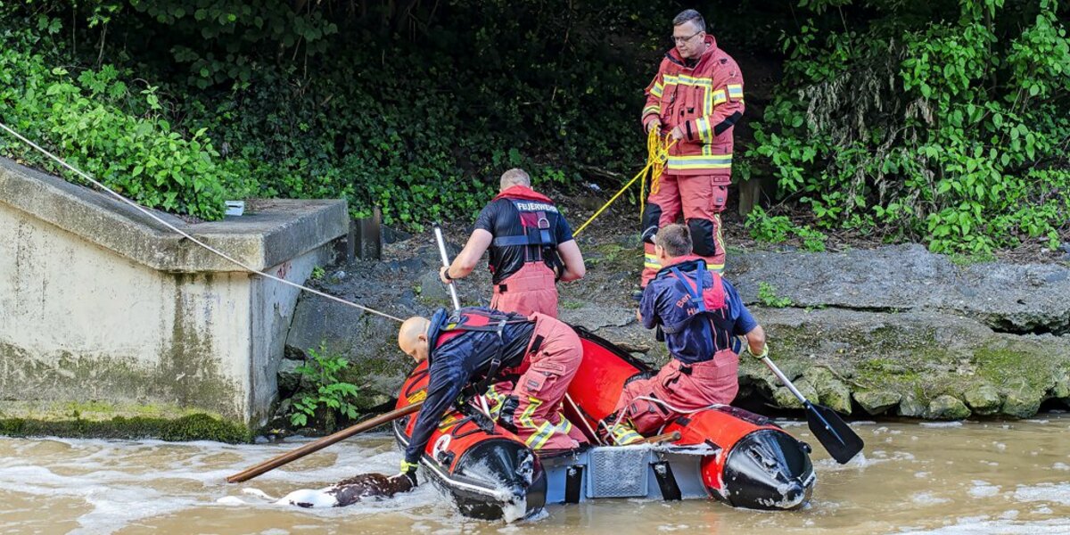 Die Feuerwehrleute griffen das Tier und zogen es mit Hilfe eines Schürhakens an Land. „Es war ein Jungkalb, ich schätze, maximal ein Vierteljahr alt“, sagt Dörrie. „Dadurch, dass es noch jung und vergleichsweise leicht war, wurde es durch das fallende Wasser des Wehrs immer wieder unter Wasser gedrückt und herumgewirbelt und eben nicht weiter herausgespült.“