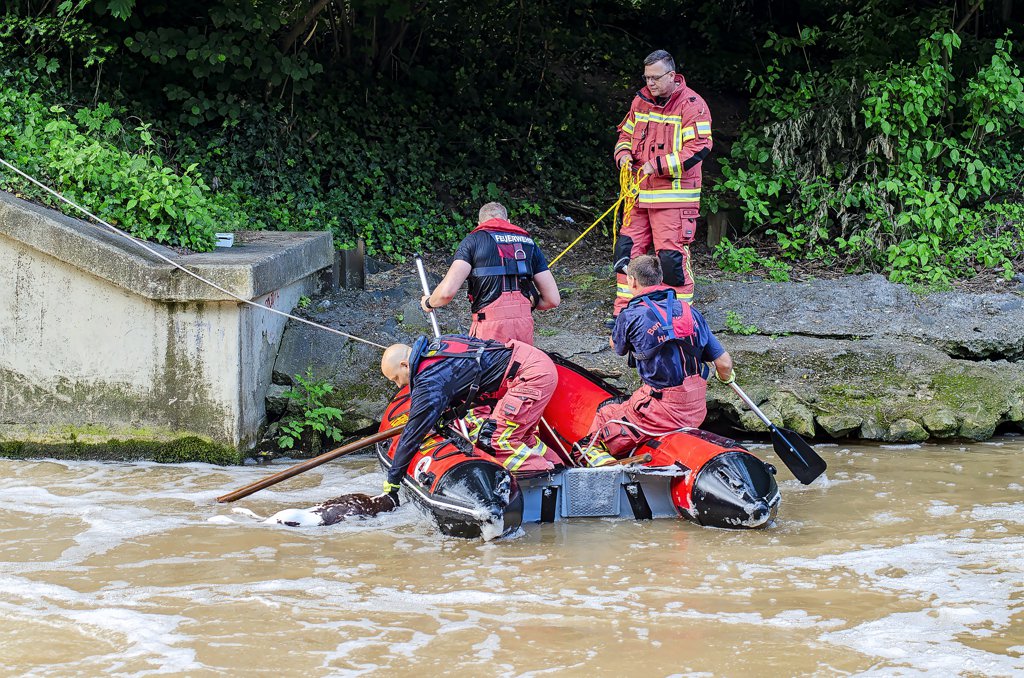 Am Mühlengraben angekommen, entdeckten die Feuerwehrleute das Kalb in der Innerste – doch sie benötigten weitere Unterstützung, um es aus dem Wasser zu ziehen. „Wir brauchten ein Schlauchboot“, erklärt Dörrie. Die Einsatzkräfte näherten sich dann langsam von der unteren Seite des Wehrs. „Für die Kollegen im Schlauchboot bestand durch den Sog keine Gefahr, dafür ist das Schlauchboot zu groß. Wenn sie unvorsichtig gewesen wären, hätten sie höchstens ein bisschen nass werden können.“