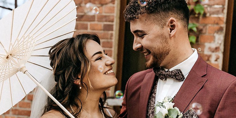 Ebenfalls wieder dabei ist ein Gespräch mit dem Paar, dessen Hochzeitsfoto in diesem Jahr das Cover des Planers ziert: Den ersten Platz im Fotowettbewerb haben Jasmin und Timo Pommer gemacht. Ausschlaggebend war hier laut der Jury der Agentur vonHier, die den Hochzeitsplaner mit Inhalt gefüllt hat, besonders der bordeauxrote Anzug des Bräutigams – eine Alternative zu den Modellen, in denen Männer sonst meistens vor dem Traualtar stehen.