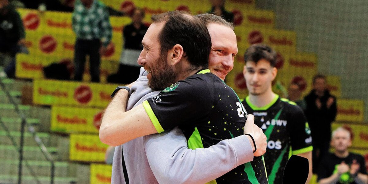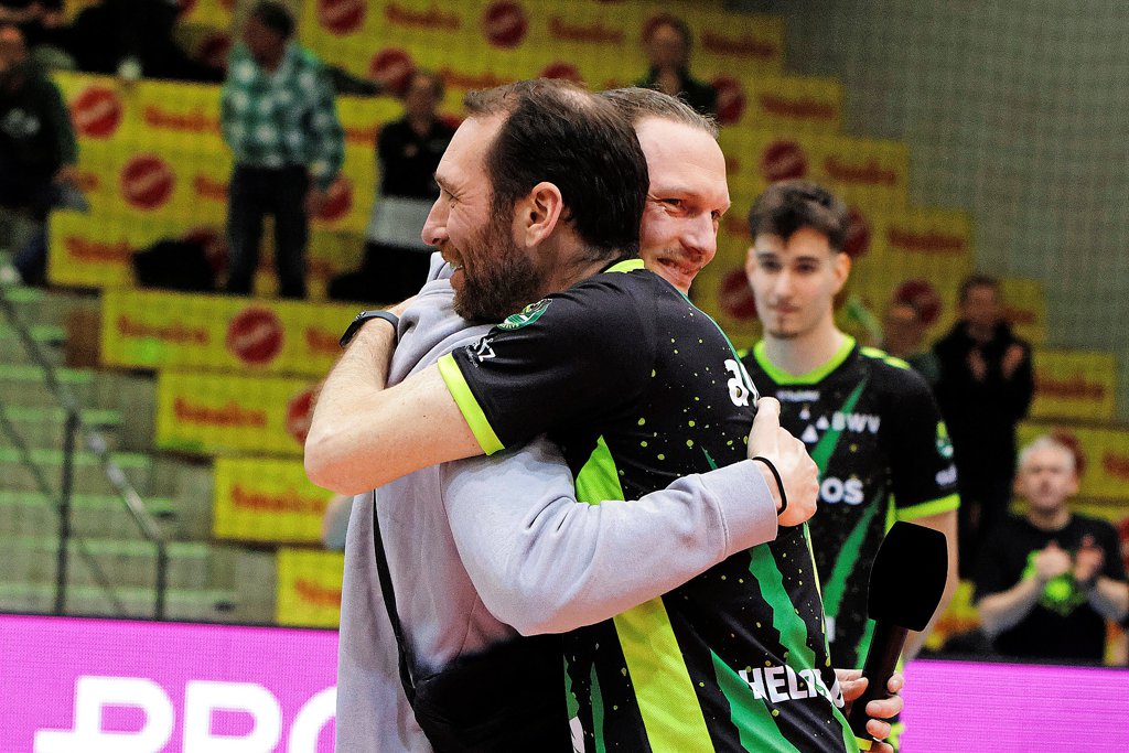 20.35 Uhr: Die Grizzlys haben mittlerweile Satz zwei und ganz frisch auch Satz drei für sich entschieden. Die Sparkassen-Arena kocht, es gibt sogar Standing Ovations. Stein hat die Hände zusammengefaltet und hält sie an den Mund. Es wirkt, als würde er beten – vielleicht Richtung Volleyball-Gott?