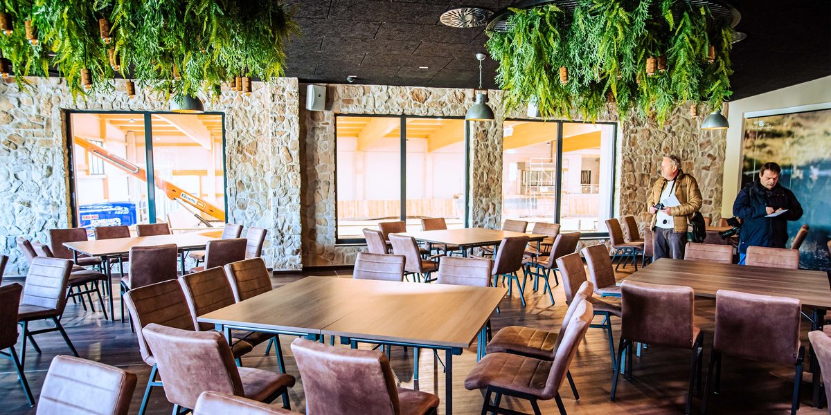 Vom geräumigen Gastraum kann der Blick über den großen Freiluftturnierplatz schweifen. Vor dem modernen Bau ist auch eine große Terrasse für die Außengastronomie und als Tribüne für die Turniere angelegt.