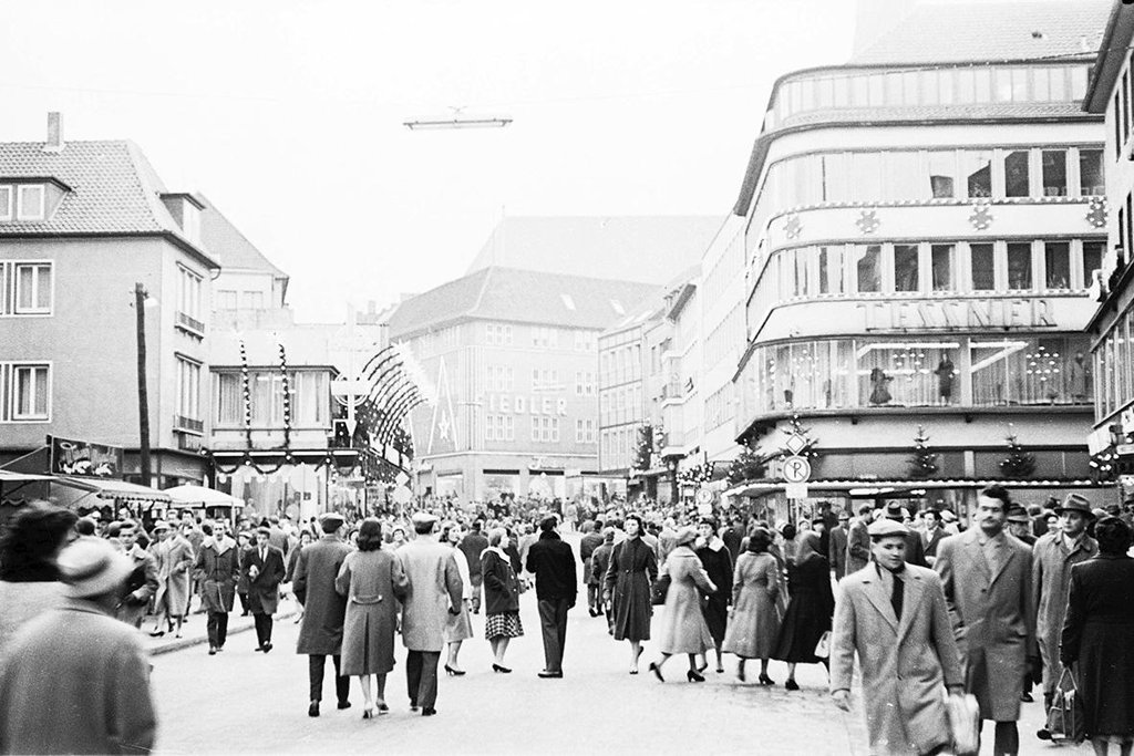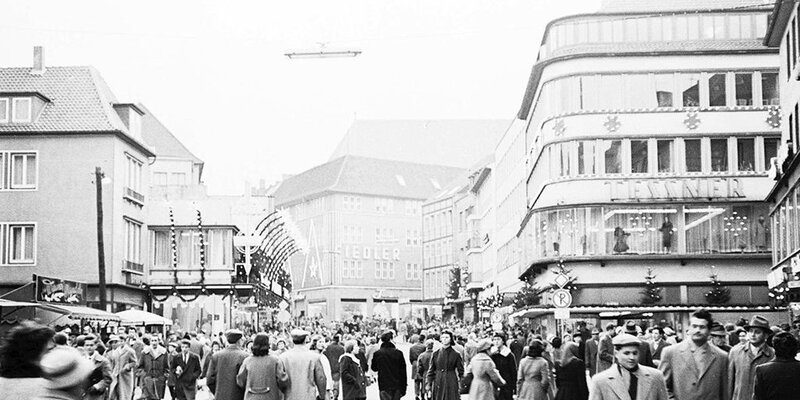 Beide Gebäude sind Kinder der Fünfziger Jahre, allerdings hat Architekt Heinz Giese an der Innerste mit seinem Entwurf für Modezar Georg Tessner die Nase vorn: Im Hohen Weg 37 sind die Handwerker schon 1952 fertig, in der Hauptstadt erreicht Hanns Dustmann erst sechs Jahre später das Ziel.