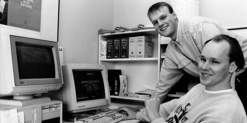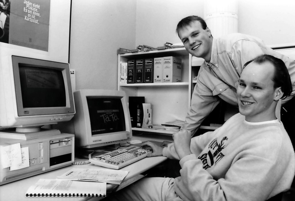 Heiko Klinges Sohn Ingo und sein Kommilitone Christian Eggers basteln neben ihrem BWL-Studium als kreative Köpfe an Plakatronic. Allein die aus heutiger Sicht bescheiden anmutende Computertechnik schlägt damals mit einem Investment von gut 100.000 Mark zu Buche, für ein Start-Up nicht leicht zu schultern.