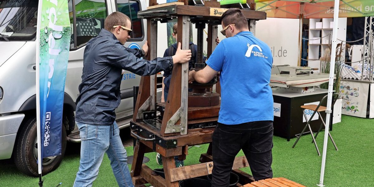 Wenige Meter weiter präsentiert die Alfelder Papierfabrik Sappi Geschichte und Gegenwart der Papierherstellung. Draußen zeigen Azubis, wie mühsam einst Papier hergestellt wurde, mit „Gautschtisch“ und einer vollen Körpereinsatz verlangenden Presse. Nebenan unterm Dach läuft eine modernere Papiermaschine, die vollautomatisch läuft.