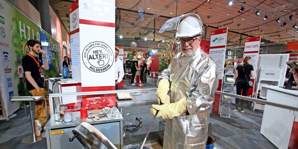Hildesheim/Hannover - Auf den ersten Blick sieht der kleine Container aus wie ein harmloser alter Eimer mit Deckel. Doch Jörg Gustke legt erst einmal dicke, silberfarbene Schutzkleidung an, bevor er sich dem Behälter überhaupt nähert. Als er vorsichtig den Deckel öffnet, wird klar, warum. Drinnen glüht flüssiges Aluminium, kräftige Wärme verbreitet sich umgehend. „Das sind 800 Grad“, sagt Gustke. Es ist unter rund 800 Ständen des Technik-Festivals auf dem Messegelände wohl der heißeste.