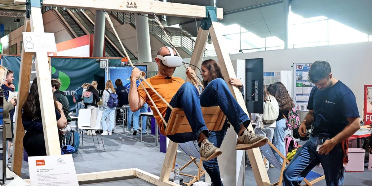 Das erste Highlight wartet gleich hinter dem Haupteingang an der Tür von Halle 9. Dort hat die Universität Göttingen eine hölzerne Schaukel aufgebaut. Wer schaukeln will, bekommt eine Virtual-Reality-Brille aufgesetzt – und je länger und stärker er schaukelt, desto höher fliegt er in der virtuellen Realität. Sieht Häuser, Bäume und schließlich die Wolken von oben, gelangt gefühlt bis ins Weltall – eine erstaunliche Erfahrung und eine gefragte Attraktion, an der sich immer wieder längere Schlangen bilden.