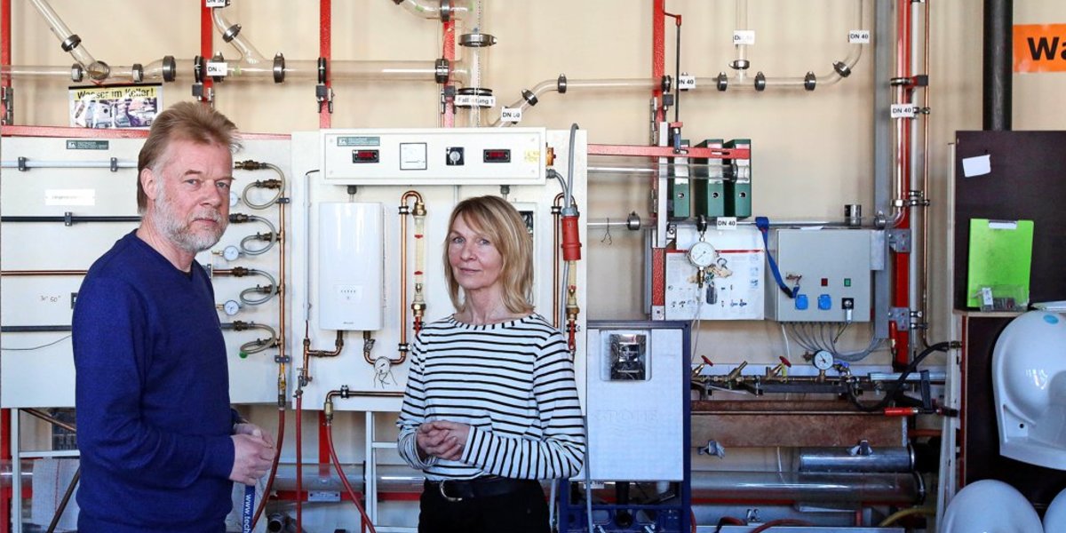 Werner-von-Siemens-Schulleiter Tilmann Diepholz-Seeger öffnet eine schwere Metalltür zum Werkstattbereich der Sanitärausbildung. Mehrere Gasthermen hängen dort zu Ausbildungszwecken, gegenüber schlängeln sich durchsichtige Abflussrohre die Wand entlang und simulieren Bad- und Küchentechnik. Soweit, so gut. „Aber wir müssten hier auch an Wärmepumpentechnik mit den Schülern und Schülerinnen arbeiten können“, sagt er bei einem gemeinsamen Rundgang mit Ute Rahlves, seiner Schulleiter-Kollegin von der Walter-Gropius-Schule. Doch die Raumsituation lasse das nicht zu.