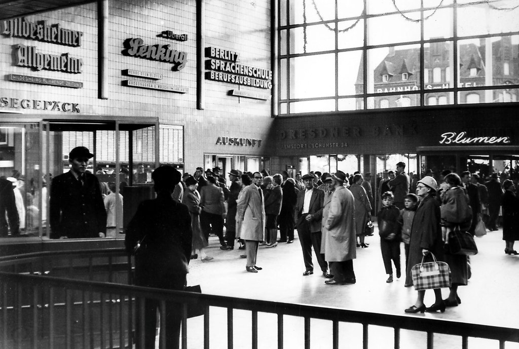 Der Hildesheimer Hauptbahnhof hat im Laufe der Jahrzehnte einen ganz schönen Wandel hinter sich: Die Bomben des Zweiten Weltkriegs überstand das Empfangsgebäude mit nur leichten Schäden, doch es war nicht nur dem Baudirektor Bernhard Haagen ein Dorn im Auge, auch die HAZ stufte die erhaltene Substanz damals wahlweise als „hässlich“, „furchtbar“ oder „fürchterlich“ ein: Das Gebäude galt als Relikt einer monströsen Zeit und entsprach nicht mehr dem Geschmack. 1959 kamen deshalb Abrissbirne und der Sprengmeister zum Einsatz. Auf dieser historischen Aufnahme vom 29. Oktober 1962 blicken wir bereits in das neue Empfangsgebäudes des Hauptbahnhofes. Durch die Scheiben im Hintergrund ist noch das gegenüberliegende Bahnhofs-Hotel zu erkennen, das schließlich 1976 auch abgerissen wurde – zwei Jahre vor Inkrafttreten des Denkmalschutzgesetzes in Niedersachsen. Auf dem Foto wird Kennern der deutschen Eisenbahngeschichte ein weiteres Detail auffallen: Bis Mitte der 60er-Jahre gab es zur Kontrolle des Passagieraufkommens Bahnsteigsperren und Bahnsteigkarten, die nicht mitreisende Personen lösen mussten, um Zugang zu den Gleisen zu bekommen. Foto: Archiv Verlag Gebrüder Gerstenberg
