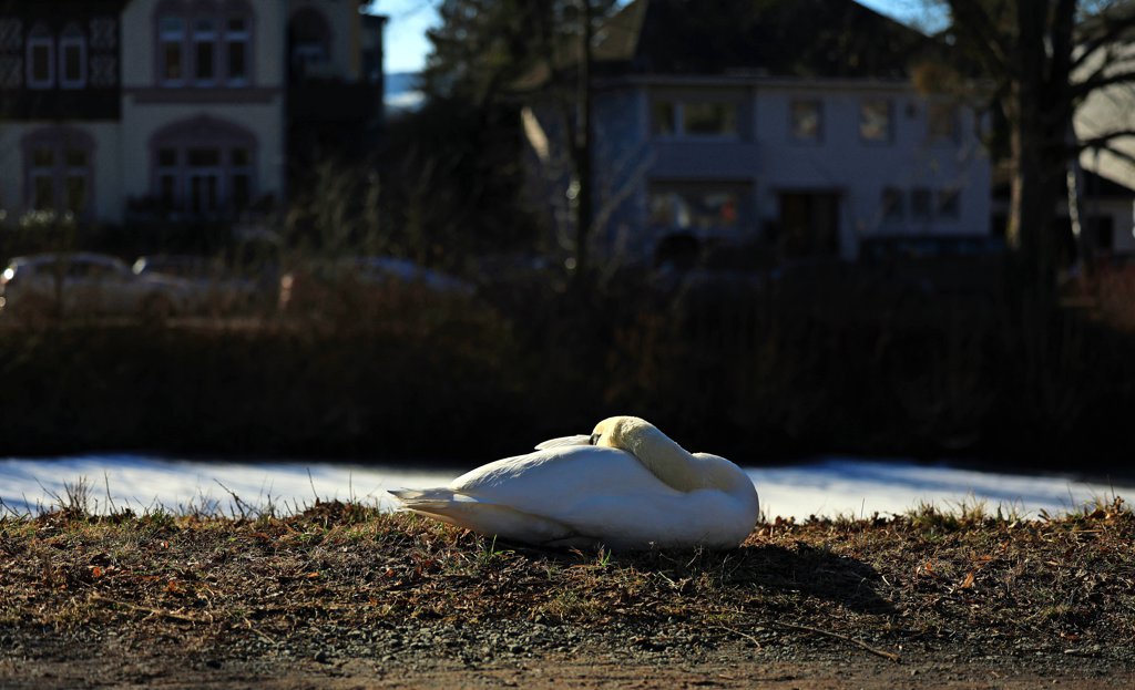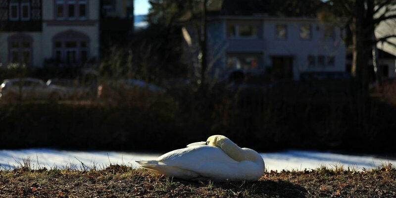 Ein sonniger, aber doch sehr kalter Tag – da muss man sich in eine dicke Jacke packen und bestenfalls auch Schal, Mütze und Handschuhe nicht vergessen. Irgendwie doof, dass es das für Schwäne nicht gibt... Dieser Gefährte auf der Aufnahme von Julia Moras hat trotzdem ein probates Mittel: Er mummelt sich am Kalenberger Graben einfach ordentlich ein.
