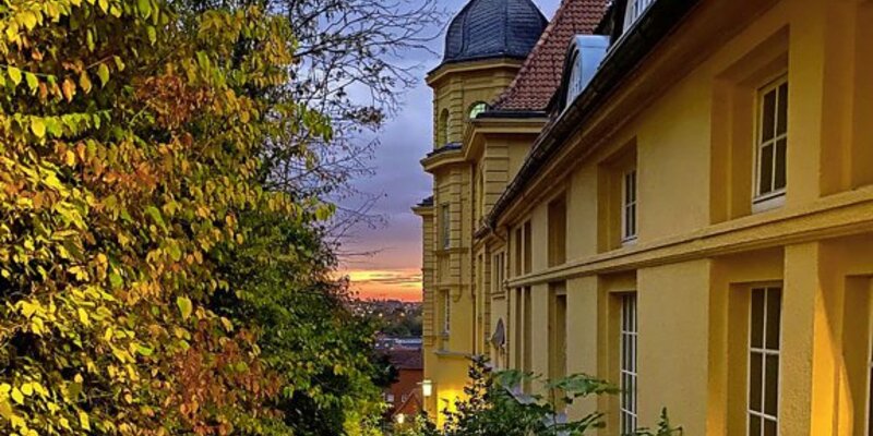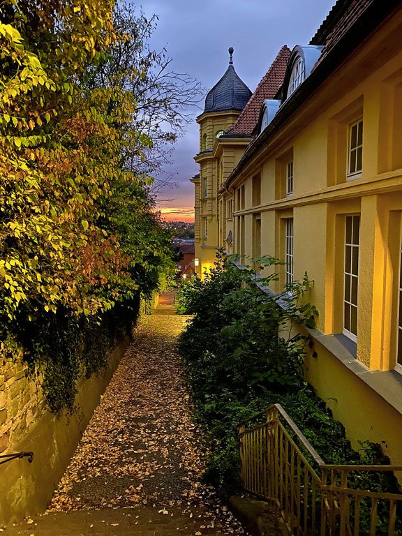 Die Gelbe Schule, das bunte Laub, die lila-blauen Wolken und der rotglühende Sonnenaufgang – Erika Klingemann hat morgens auf dem Weg zur Arbeit ein wunderbares Farbenspiel am Hildesheimer Moritzberg eingefangen.