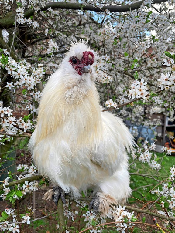 Ute Aue hingegen konnte ihren Hingucker-Vogel aus nächster Nähe betrachten. „Es ist wohl ein Seidenhuhn, das es sich im blühenden Busch gemütlich gemacht hat“, schreibt Umfragen-Teilnehmerin Heidi Walter und begründet ihre Entscheidung mit: „Sehr hübscher Kontrast.“ (Bild anklicken, um es in voller Größe anzuzeigen)