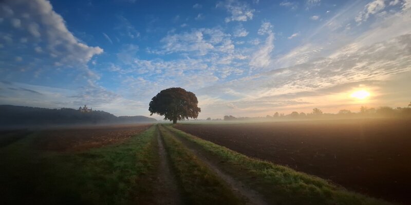 Sonne, Wolken, Nebel und eine idyllische Landschaft: Fast könnte man meinen, dieses Bild sei gemalt und nicht fotografiert worden. So schön kann der Oktober sein. Und wer im Hintergrund noch ein bisschen auf die Suche geht, kann sogar noch das Schloss Marienburg erkennen, das derzeit umfangreich saniert wird. Foto: Karin Krügeler