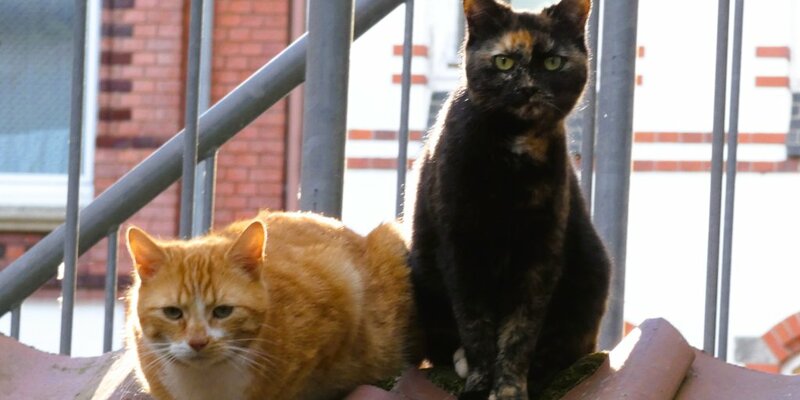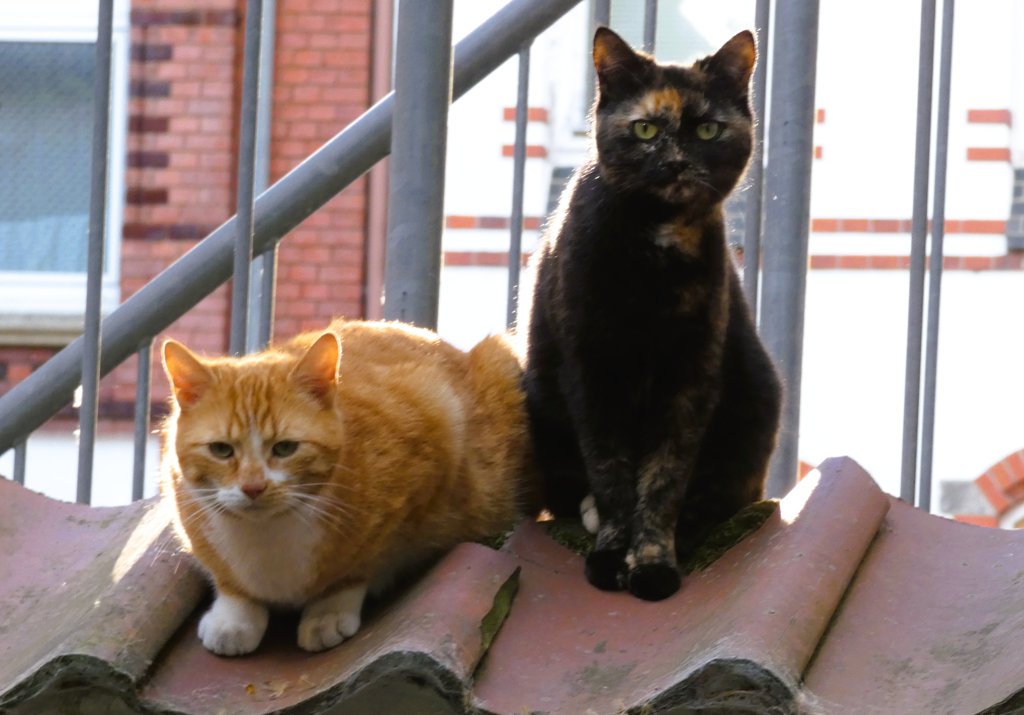 Auf der Mauer, auf der Lauer liegen Johnny und Erika, gesichtet von Uwe Stache. Die eine mit bernsteinfarbenem Pelz, die andere düster und geheimnisvoll gemustert – gemeinsam halten sie Wacht auf dem Dach, als wären sie die Herrscher ihres Viertels. Was sie sehen? Was sie denken? Niemand weiß es. Doch ihre Präsenz spricht Bände. Ein kurzer Moment, eingefangen zwischen Sonnenstrahlen und Schatten.