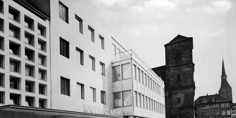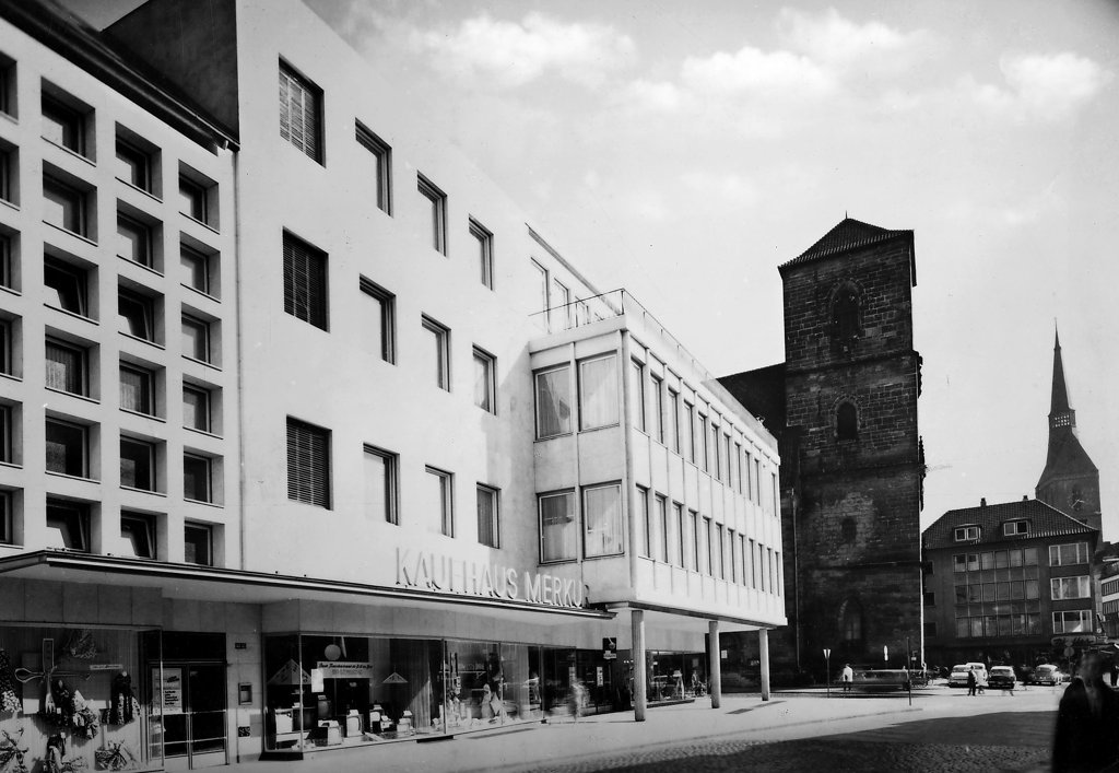 Der Name ist auch nach mehr als sechs Jahrzehnten immer noch fest im Gedächtnis vieler Hildesheimer und Hildesheimerinnen verankert: Merkur. „Mit diesem Haus hat Hildesheim eines der modernsten Kaufhäuser Deutschlands!“, bescheinigte Wilhelm Fonk, Vorstandsvorsitzender der Merkur Aktiengesellschaft, damals im September 1957 zur Eröffnung – die sich rund 4000 Besucherinnen und Besucher nicht entgehen lassen wollten. In der Rekordzeit von nur 102 Arbeitstagen hatten Arbeiter das Gebäude zwischen Alms-, Jakobi- und Gerberstraße errichtet. Dabei wurden unter anderem 500.000 Kilogramm Baustahl eingearbeitet, 20.000 Meter elektrische Leitungen und 6000 Meter Leuchtstoffröhren verlegt. In den fünf Geschossen, die mit drei Rolltreppen verbunden waren, fand sich so ziemlich alles, was das Käuferherz begehrt. Von einer Sonnenterrasse aus konnten die Menschen sogar dem vorbeifahrenden Verkehr der Innenstadt zuschauen – denn die Almsstraße war damals noch keine Fußgängerzone. Die historische Aufnahme aus der Sammlung Doht, die kurz nach der Eröffnung 1957 entstand, zeigt das Kaufhaus – und im Hintergrund sowohl die Jakobikirche als auch den Kirchturm von St. Andreas. Etwas mehr als zwölf Jahre lang betrieb der gleichnamige Nürnberger Konzern die Merkur-Filiale in Hildesheim. Am 28. Februar 1970 hatten die letzten Merkur-Mitarbeiter den Bau in der Almsstraße verlassen, er wurde schließlich abgerissen. An gleicher Stelle baute unmittelbar danach Horten sein Kaufhaus, das am 28. Oktober 1971 eröffnete und seit 1998 unter dem Namen Galeria Kaufhof firmierte. Nach dem Aus der Kaufhof-Filiale im Januar 2024 ist nun der Discounter Tedi mit einer Filiale dort eingezogen.
