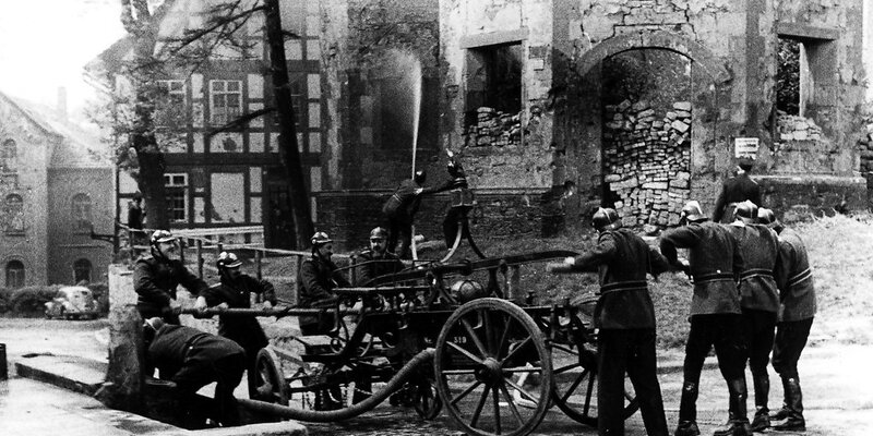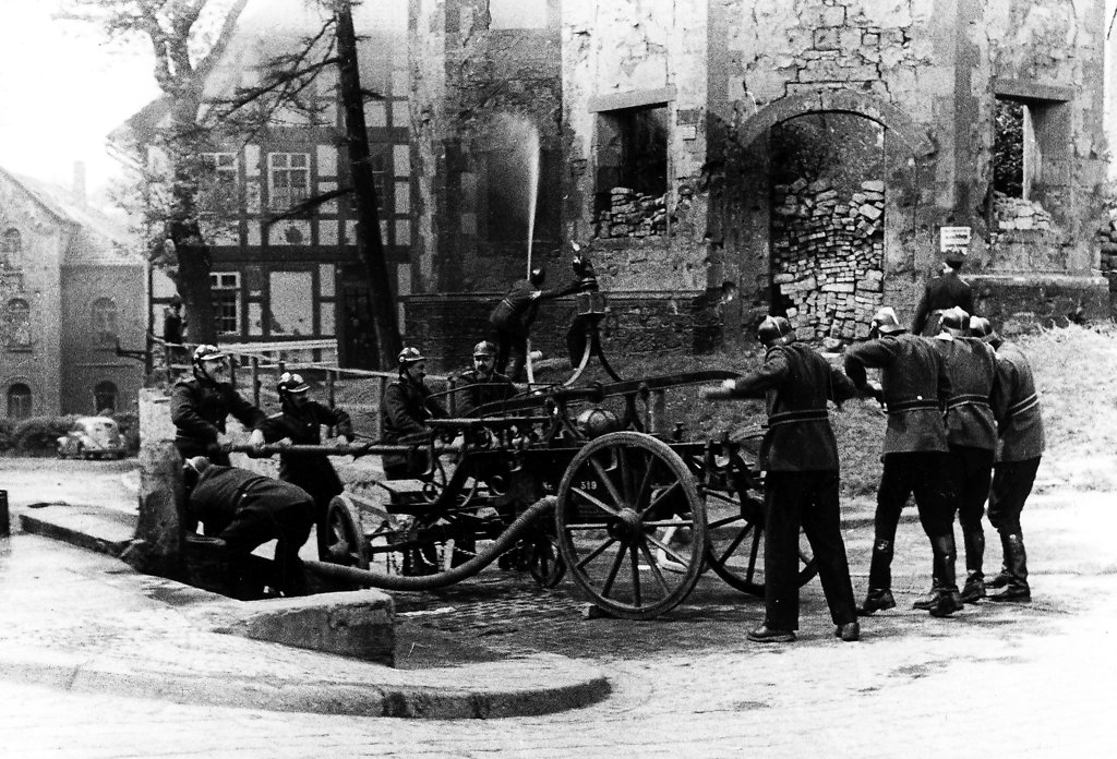 Eines der seltenen Fotos, das einen Feuerwehreinsatz in Hildesheim während der Kaiserzeit zeigt? Schön wär’s. Aber spätestens beim Blick auf den VW Käfer im Hintergrund wird dem Betrachter bewusst, dass auf dem Foto etwas nicht stimmt. Der gut gelaunte Feuerwehrtrupp muss jüngeren Jahrgängen angehören, trägt erkennbar falsche Bärte und ist offenbar nur kostümiert. Zudem ist die Handspritze zwar echt und einsatzbereit, gelöscht werden soll mit ihrem Wasserstrahl aber eine als einsturzgefährdet markierte Ruine. Merkwürdigkeiten über Merkwürdigkeiten.