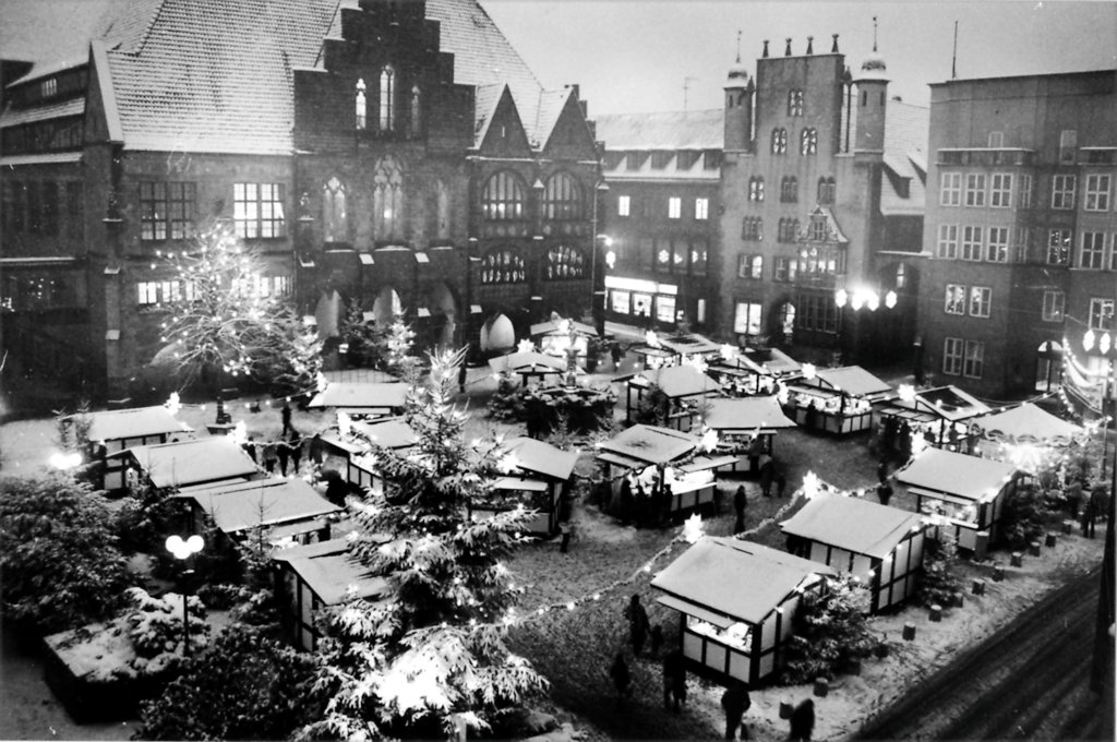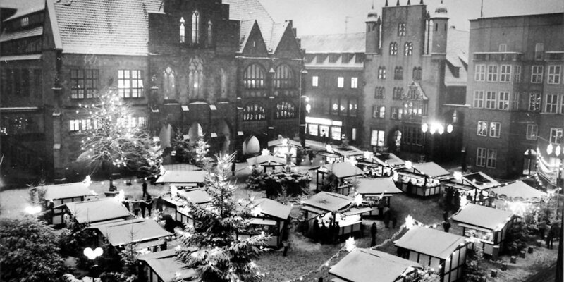 Der Weihnachtsmarkt ist auf dem Hildesheimer Marktplatz und auf der Lilie – logisch, richtig? Zugegeben: Früher war das nicht ganz so selbstverständlich, nach dem zweiten Weltkrieg reihten sich für mehrere Jahre die Buden mit Bratwurst, Lebkuchen, Zuckerwatte und Glühwein auf dem Andreasplatz. Dort gab es auch drei Kinderkarussells, doch der Zuspruch blieb verhalten. 1981 schließlich wurde die Vorkriegstradition fortgesetzt: Der Weihnachtsmarkt zog wieder auf den Marktplatz mitsamt 20 Buden in Fachwerkoptik. Wie heimelig das damals aussehen konnte, zeigt die historische Aufnahme vom 12. Dezember 1981 – Schnee inklusive. Foto: Archiv Verlag Gebrüder Gerstenberg