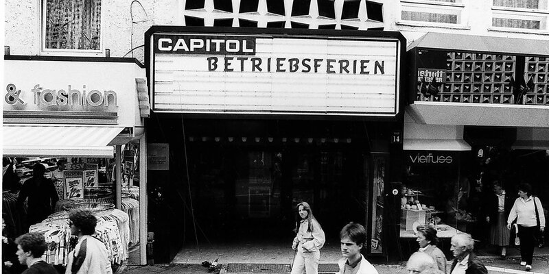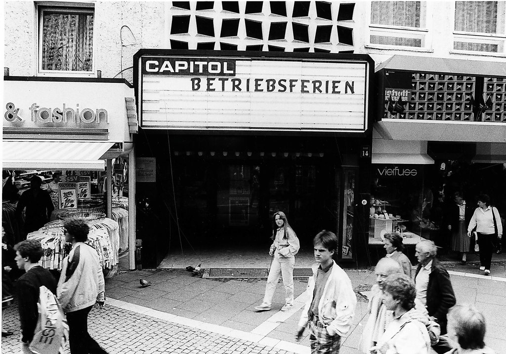 Wo an der Schautafel einst der Film des Abends annonciert worden war, ist auf dieser historischen Aufnahme vom 31. Juli 1987 der euphemistische Hinweis „Betriebsferien“ zu lesen. Tatsächlich waren im Capitol für immer die Lichter ausgegangen, hinter den verschlossenen Türen wurde bereits die Ausstattung demontiert. Dabei galt der traditionsreiche Filmpalast vielen als das einst wohl schönste Kino der Stadt.