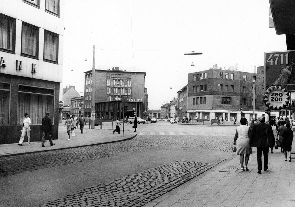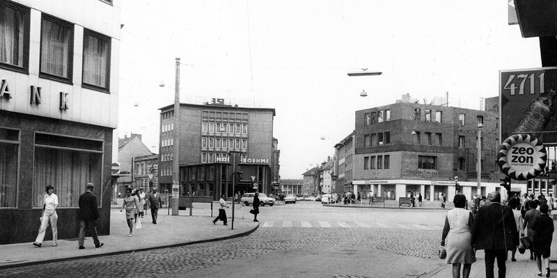 Werbung für Kölnisch Wasser, die Buchstaben A, N und K an der Hausfassade links, dazu ein Zebrastreifen, wo heute keiner mehr ist und das Wissen: Früher durften hier noch Autos rüberfahren. Die historische Aufnahme, die rund um das Jahr 1964 entstanden ist, zeigt den Blick auf die damalige Almsstraße und das Almstor. Und damit auch einen Bau, der früher erst Hotel war, dann Möbelhaus – und bei dem nach der Zerstörung am 22. März 1945 die Schiffsbug-Idee wieder auf den Tisch kam. (Foto: Archiv Verlag Gebrüder Gerstenberg)