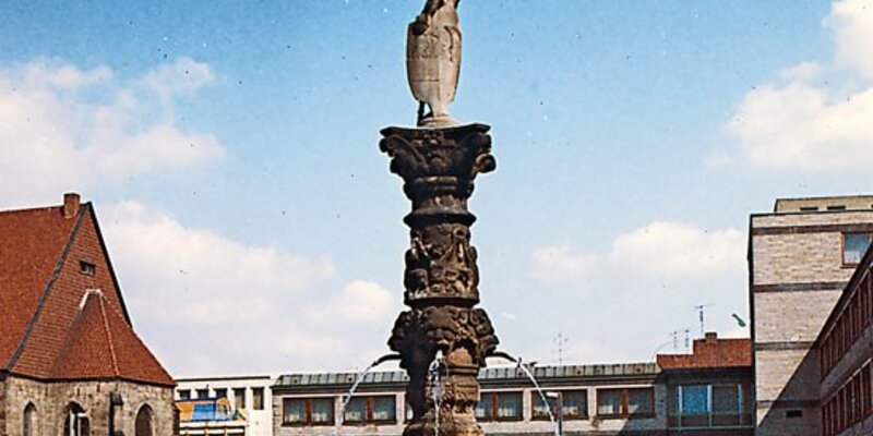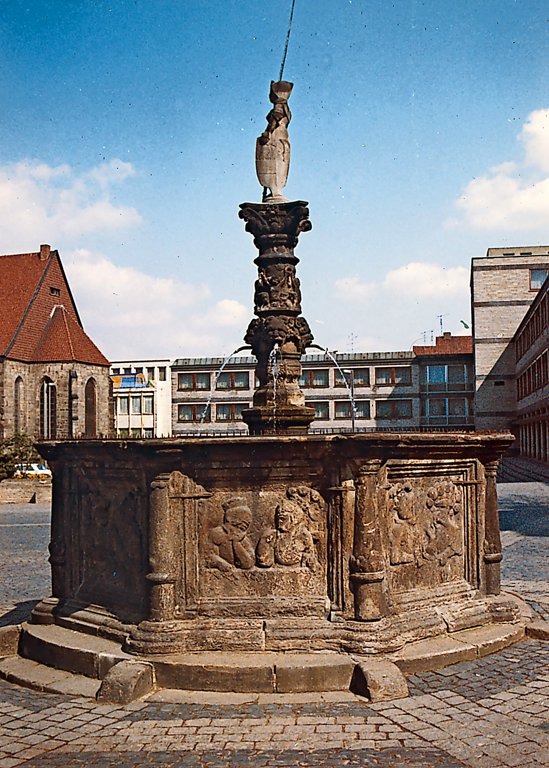 Der Brunnen, der während der Bauarbeiten für die Tiefgarage unter dem Marktplatz ohnehin versetzt werden müsste, soll ins Museum gebracht, an seiner Stelle eine originalgetreue Kopie aufgestellt werden. Möglich wird das durch einen Fund im Landesmuseum Braunschweig, hier hat man gerade Holzstiche von Georg Pencz aus dem frühen 16. Jahrhundert wiederentdeckt. Mit der von ihm gestalteten „Ehrenpforte der zwölf sieghaften Helden des Alten Testamentes“ als Vorbild gingen anno 1540 die Hildesheimer Bildhauer ans Werk und schnitten die Brunnenreliefs aus dem Stein. Der Königslutterer Bildhauer Georg Arfmann setzt diese Tradition nun fort und arbeitet die Kopie bis ins kleinste Detail nach. Im Frühjahr 1986 sprudelt aus dem neuen alten Brunnen wieder frisches Wasser. Das Dauerthema „Sanierung Marktbrunnen“ hat sich damit von der Tagesordnung der Ratssitzungen verabschiedet.