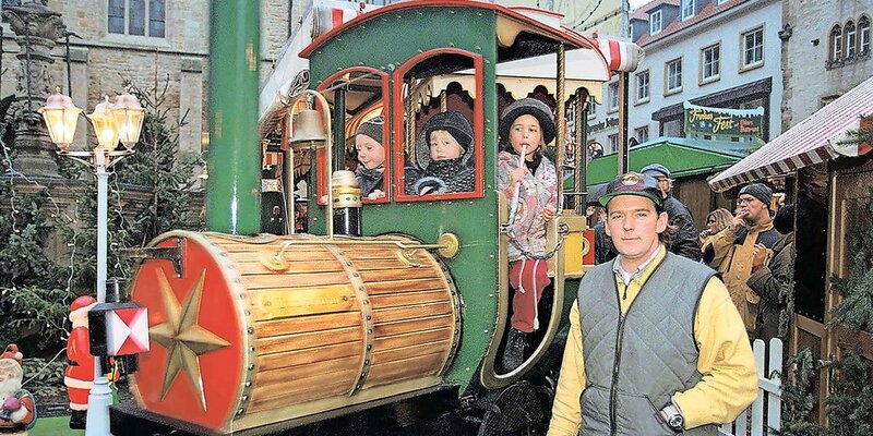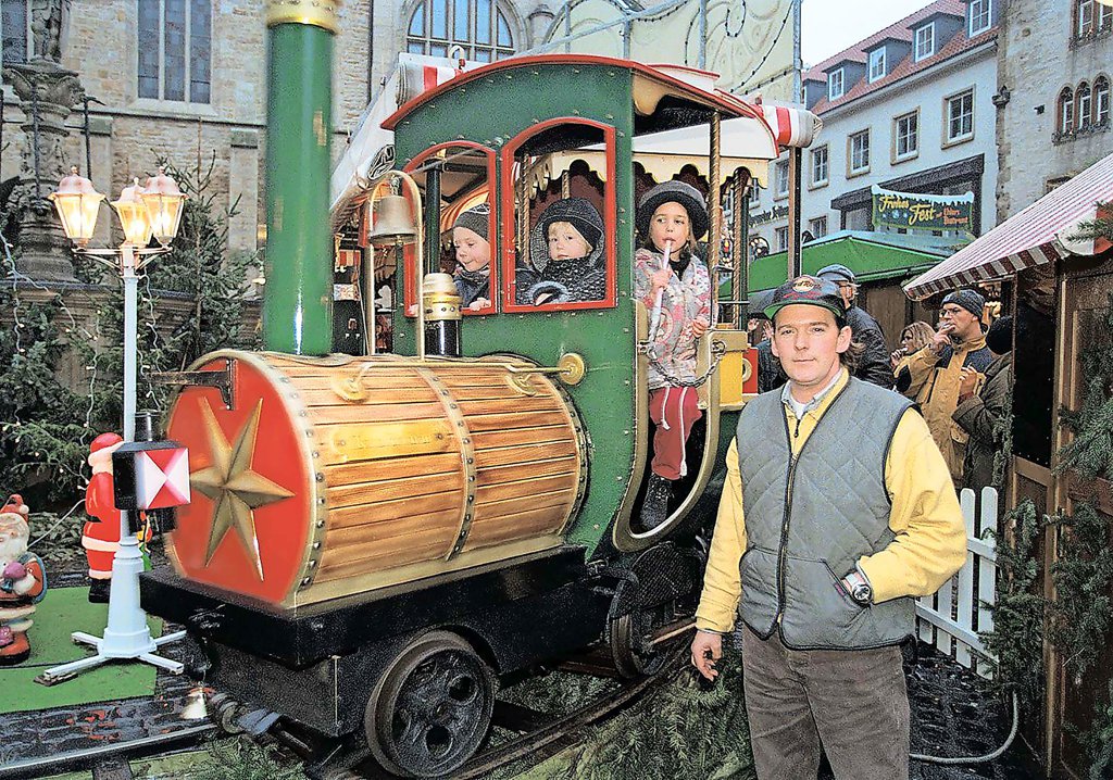 Bitte alle einsteigen, die Bimmelbahn fährt gleich los! Diesen Satz hört man heutzutage nicht mehr auf dem Hildesheimer Weihnachtsmarkt – dabei war er früher ganz normal und sorgte für jede Menge Vorfreude bei Kindern aus nah und fern. Von 1991 an drehte die Kindereisenbahn der Familie Behrend/Hartmann aus Hoyershausen ihre Runden um den Rolandbrunnen und ließ dabei stets den Blick auf die steinernen Ornamente frei, eine Auflage, die die Stadt bei der Genehmigung auch explizit so formulierte. Die historische Aufnahme zeigt Besitzer Julius Ahrend am 21. Dezember 1997. (Foto: Archiv Verlag Gebrüder Gerstenberg)