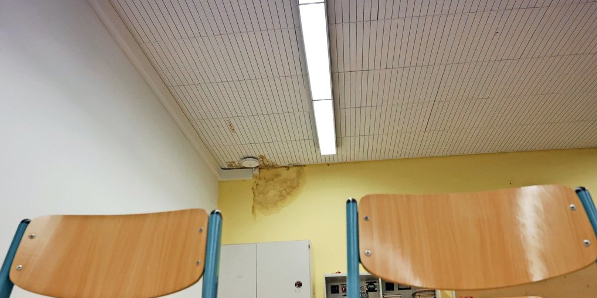 Dralle begutachtete jüngst gemeinsam mit dem Chef des Schulwerks, Gerd Brinkmann, die Schäden in den einzelnen Trakten. Oftmals sind es kleine feuchte Stellen, die weitaus größere Probleme andeuten. An vielen Stellen sind die Flachdächer undicht. Außerdem sind viele Leitungen für die Entwässerung im Mauerwerk verlegt. Weil es sich dabei um Gusseisen-Rohre handelt, sind die Leitungen nach Jahrzehnten undicht – Wasser dringt durch die Wände in die Schule. Und für die Reparaturen müssen Wände aufwendig aufgestemmt werden.