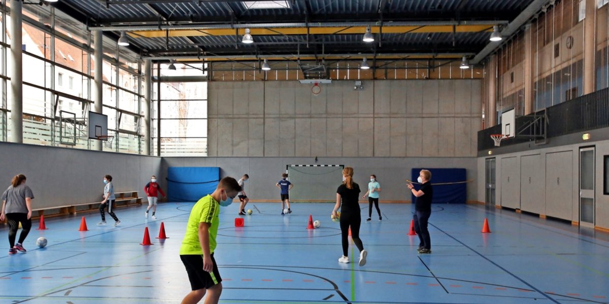 In der Sporthalle des Gymnasiums übt derweil die halbe Klasse 7 A Fußballtechniken. Alle Mädchen und Jungen tragen durchgehend Mund-Nasen-Masken.