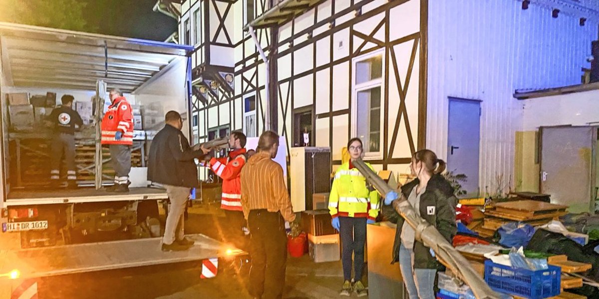 Wenige Minuten nach der Alarmierung erfuhr auch Sieglinde Deffner-Korrmann, Vorsitzende des Holler DRK, von dem Unglück. Sofort machte sich die Vorsitzende auf den Weg – in voller Sorge. Denn im rechten Gebäudeteil hat das DRK sein Domizil, mit Gemeinschaftsraum, Material für Blutspenden, Jugendgruppe – aber auch für den Katastrophenschutz. „Erst durften wir nicht rein“, berichtet sie. Schließlich sei nicht sicher gewesen, ob auch der rechte Gebäudeteil Schaden genommen hatte. Als klar war, dass dies nicht der Fall war, begannen die Vorsitzende und zwölf herbeigeeilte Helfer, die Räume auszuräumen und das Material in einen Lastwagen der angerückten DRK-Bereitschaft zu verladen. „Wir feiern in diesem Jahr unser 50. Jubiläum und sind eigentlich im Jubiläums-Stress“, sagt Deffner-Korrmann. Obwohl sie total übernächtigt ist, macht sie sich Sorgen um die Zukunft. „Wo sollen wir jetzt hin?“, fragt sie am Dienstagmorgen. Im August sollte in den Räumen ein Repair-Café an den Start gehen, im Herbst waren Smartphone-Kurse für Senioren geplant.