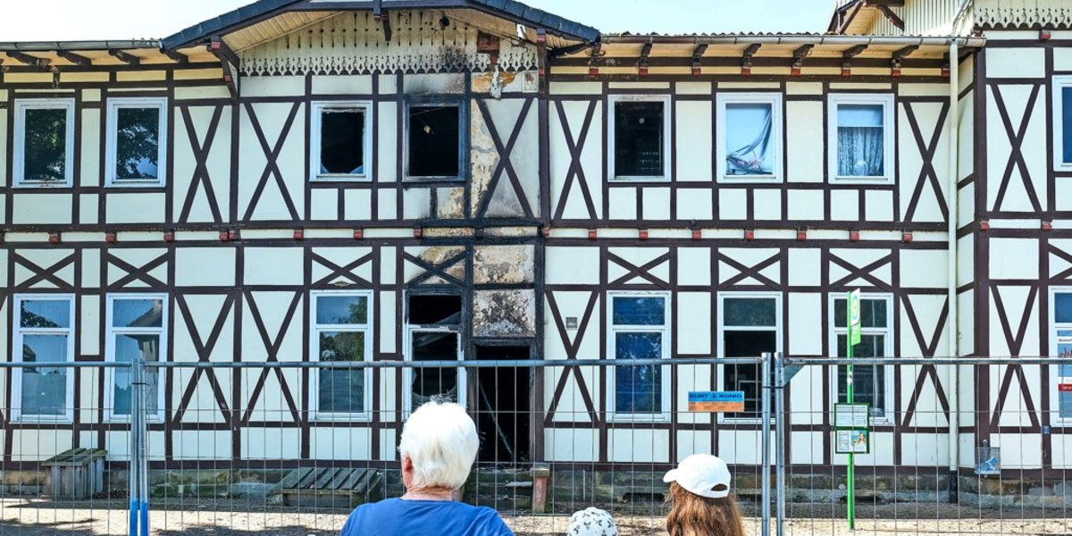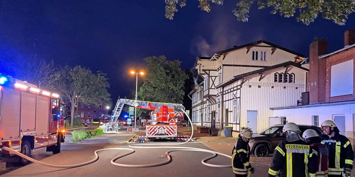 Holle/Derneburg - Rauchgeruch liegt auch am Morgen noch in der Luft am Derneburger Bahnhof, Feuerwehrleute sind auf dem Vorplatz dabei, die Schläuche aufzurollen, der Eingang des linken Gebäudeflügels ist mit Flatterband und Gittern abgesperrt: In der Nacht von Montag auf Dienstag stand das Derneburger Bahnhofsgebäude in Flammen. Zwei Menschen sind dabei verletzt worden, eine Person schwer. Sie musste mit dem Rettungshubschrauber in eine Klinik gebracht werden. Drei Mieter einer anderen Wohnung im Gebäude kamen unverletzt davon. Sie sind nun bei Bekannten untergekommen.