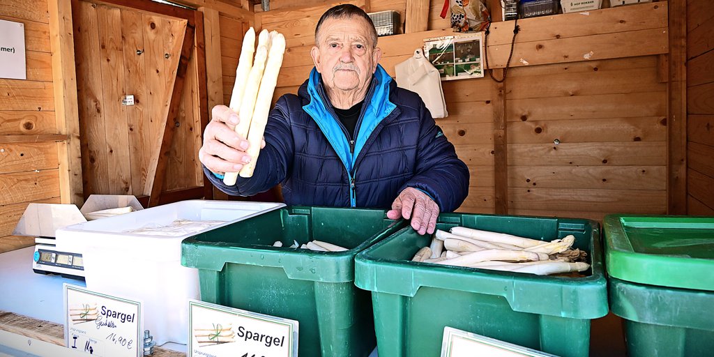 So ist es auch bei Kurt Ewert: Den Spargel wird er nur etwa bis 24. Juni anbieten, dann ist die Saison vorüber. Sein Stand aber bleibt vier Monate lang geöffnet – und das Tag für Tag. Denn auf den Spargel folgen Erdbeeren und Kirschen, außerdem gibt es an seinem Stand auch Kartoffeln sowie Honig von einer Imkerin aus der Nachbarschaft.