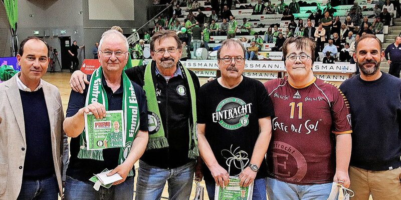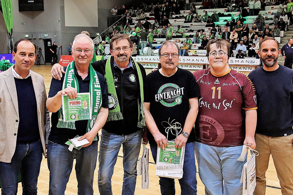 Das Spitzenspiel gegen Emsdetten ist ein HAZ-Gameday gewesen – Daniel Rothert (rechts), Leiter Vermarktung bei der HAZ, übergab an Manfred Königsdorff, Wolfgang Flehe, Matthias Keßler und Daniel Krause die Preise aus einem Gewinnspiel. Ganz links: Siegfried Schröder, Geschäftsführer der Bürger Bau-und Heimwerkermärkte GmbH.