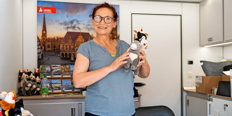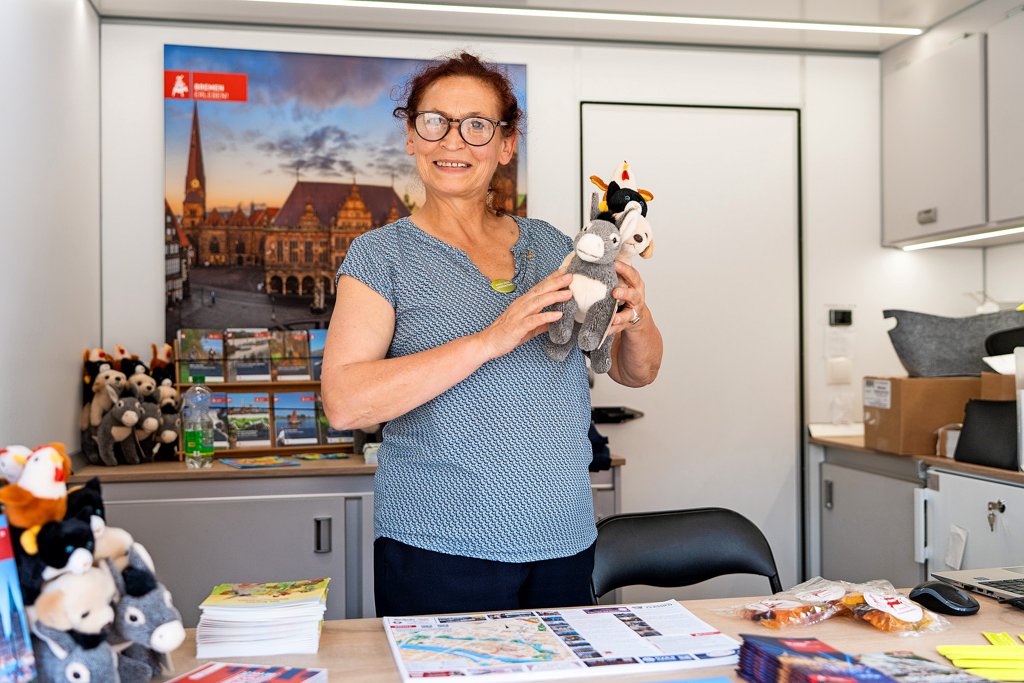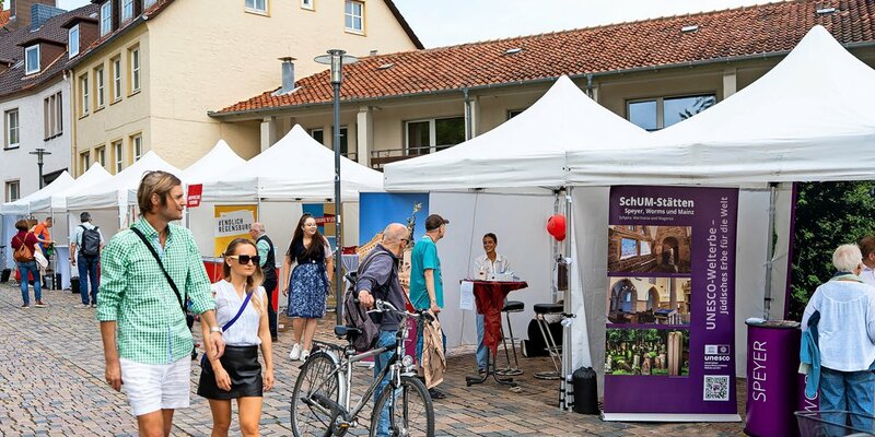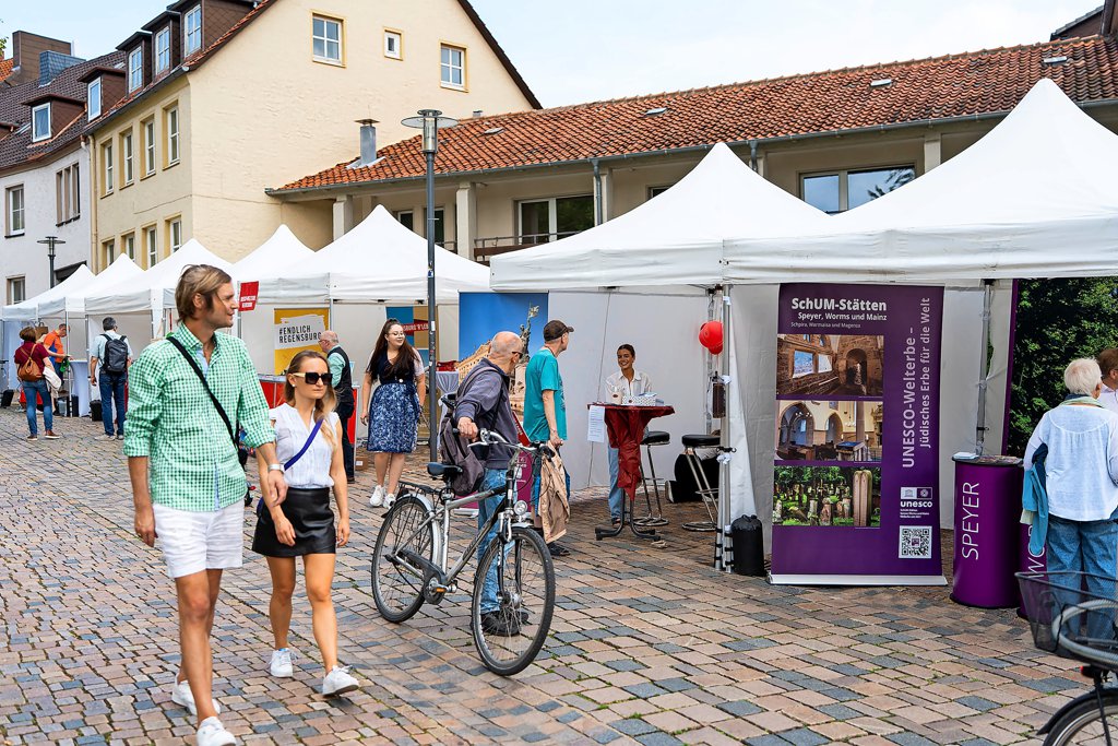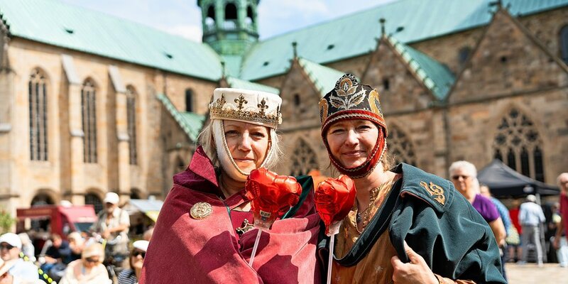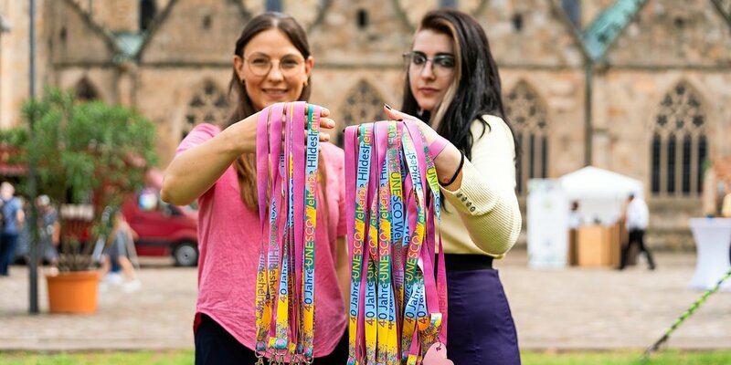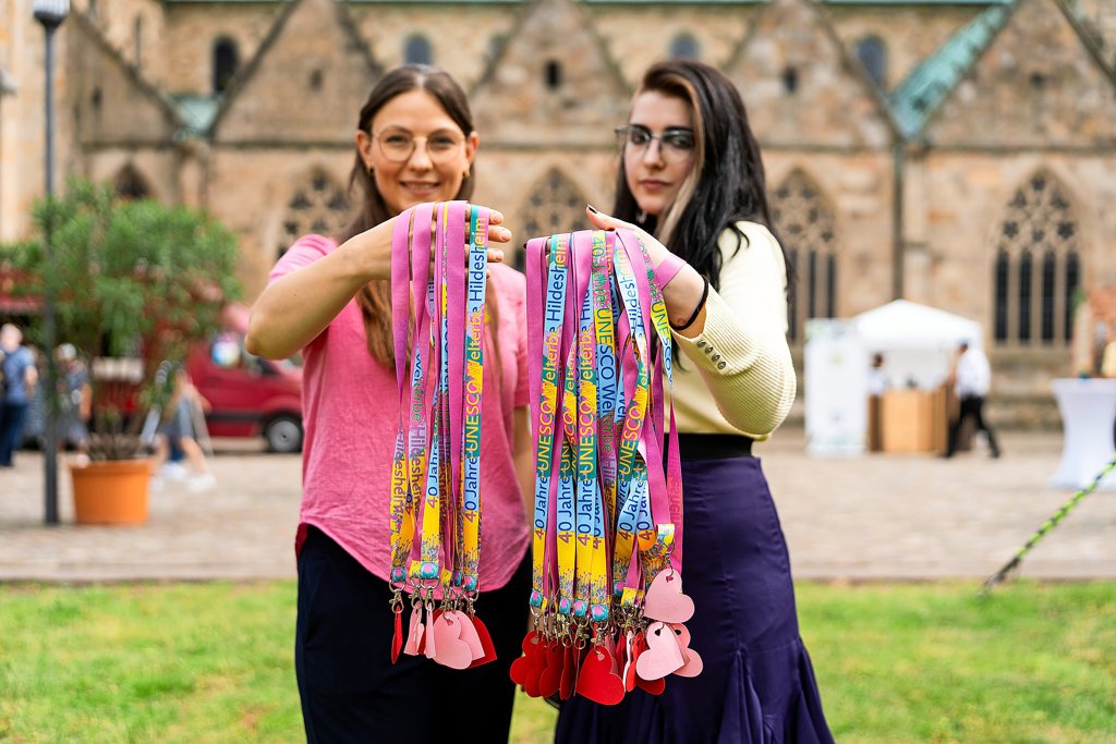 Eine besondere Aktion hat sich das Team vom Dommuseum für den Welterbemarkt ausgedacht. Am Samstag haben sich alle Städte bei einem Speeddating auf dem Domhof in Kurzfassung vorgestellt. Anschließend haben Mitarbeitende aus dem Dommuseum (im Bild: Monja Dierkes und Johanna Piper) diese Schlüsselbänder mit Herz-Anhänger im Publikum verteilt. Diese konnte man dann an einem Stand seiner Wahl gegen eine Kleinigkeit eintauschen – je nachdem, welchem Welterbe man sein Herz schenkt. Foto: Clemens Heidrich
