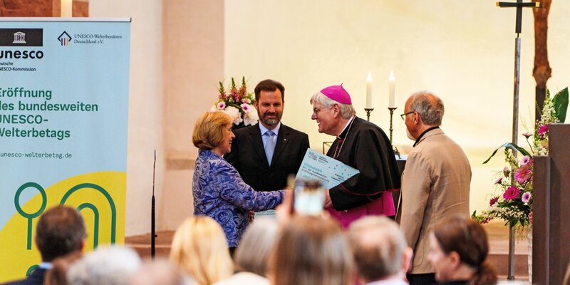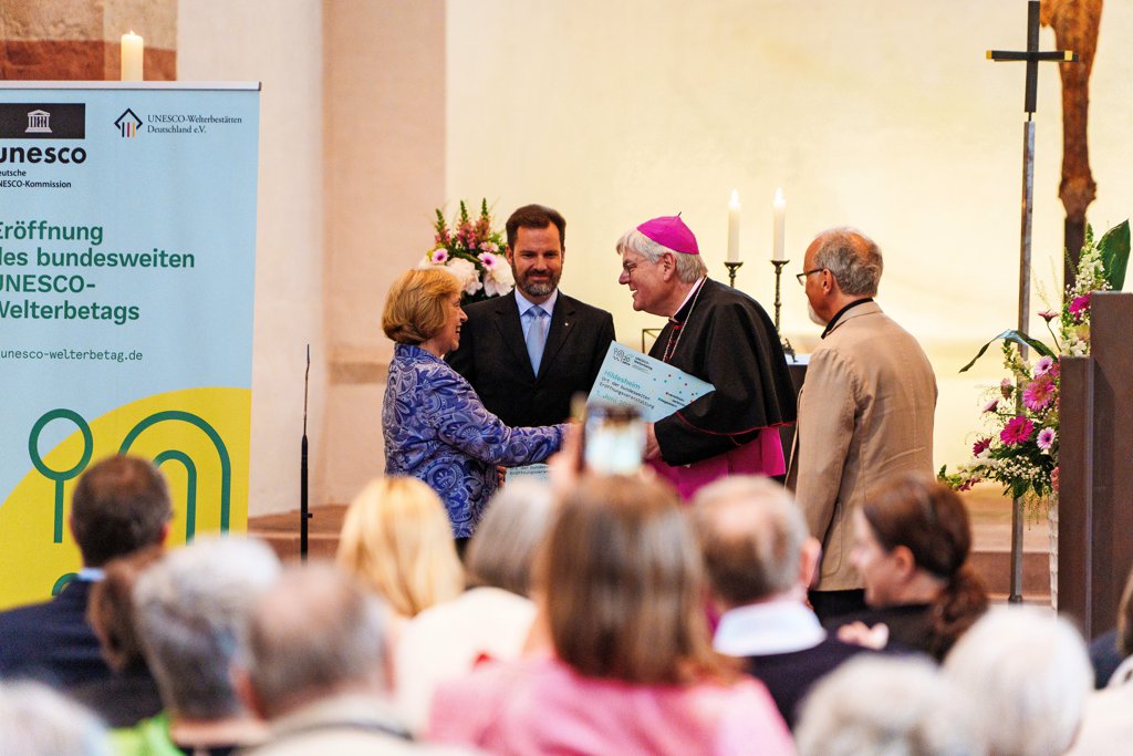Schluss- und wohl auch Höhepunkt der offiziellen Eröffnung in St. Michael, die sich an den ökumenischen Gottesdienst anschließt: Maria Böhmer, Präsidentin der Deutschen UNESCO-Kommission übergibt eine Tafel an den emeritierten Weihbischof Heinz-Günter Bongartz. Dadurch ist Hildesheim – St. Michael und der Dom bilden das hiesige Welterbe im Verbund – ausgezeichnet als eine der Gaststätten vom Welterbe-Tag. Die Übergabe geschieht im Beisein von Fritz Ahrberg (links), dem Geschäftsführer von Hildesheim Marketing und Vorsitzenden der UNESCO Welterbestätten Deutschland. Foto: Clemens Heidrich