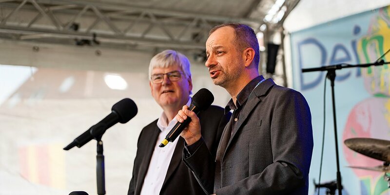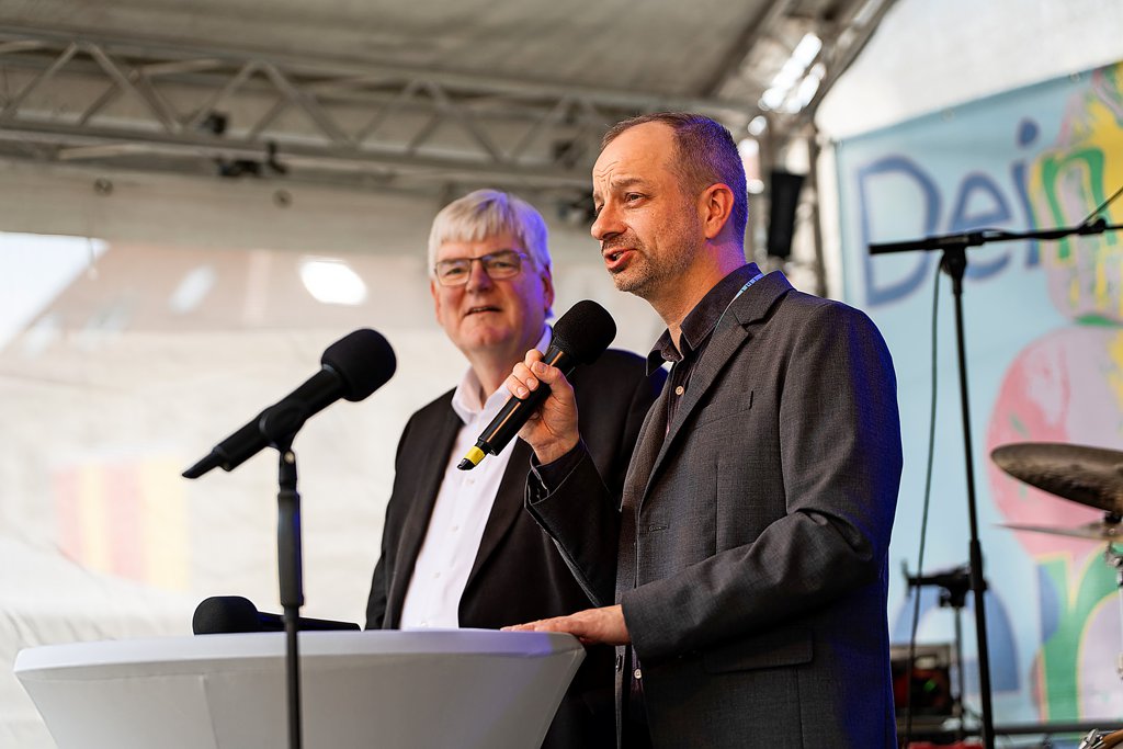 Auf dem Domhof konnte sich das Publikum unter einen kleinen Pavillon vor der Bühne setzen. An allen Tagen waren die Reihen immer gut gefüllt. Freitag und Samstag haben der emeritierte Weihbischof Heinz-Günter Bongartz (links) und Felix Prinz, Direktor des Dommuseums, als Hausherren am Domhof begrüßt. Für Programm und Organisation war eine Gruppe aus dem Bistum und von Hildesheim Marketing, der Sozialagentur Cluster und dem Dommuseum zuständig. Anderthalb Jahre haben die Planungen in Anspruch genommen. Dem emeritierten Weihbischof ist vor allem wichtig, die beiden Kirchorte – die zusammen das Welterbe von Hildesheim bilden – nicht ausschließlich unter künstlerischen Gesichtspunkten zu begreifen, sondern als lebendiges Erbe der Vorfahren. Foto: Clemens Heidrich