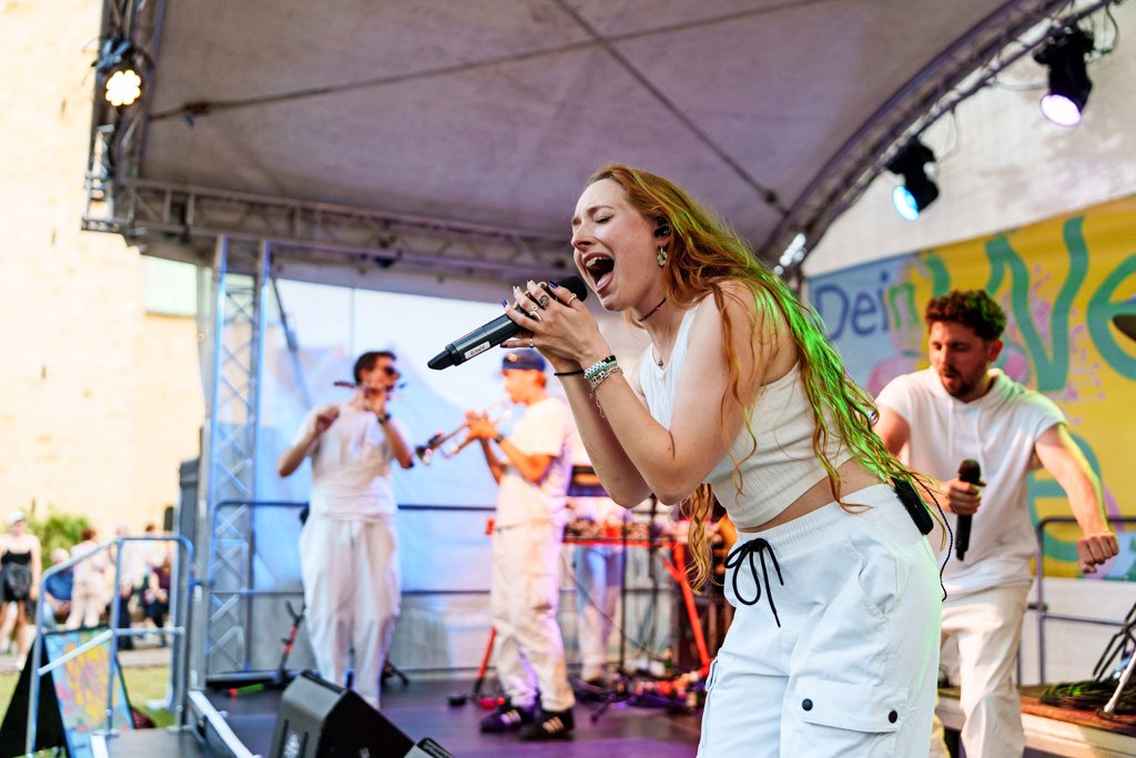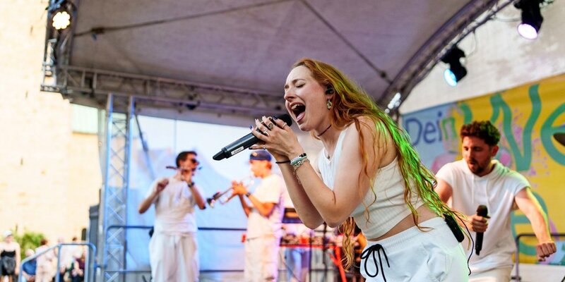Für viele Zuschauer ein Highlight am Samstagabend: Der Auftritt von Passepartout. Die Gruppe aus Hannover, die deutsch-französischen Rap mit tanzbarem Bläser-Sound verbindet war zwar erst vor ein paar Tagen beim Campus-Fest der Universität Hildesheim zu hören. Dem Andrang auf dem Domhof tat das aber keinen Abbruch. Foto: Clemens Heidrich