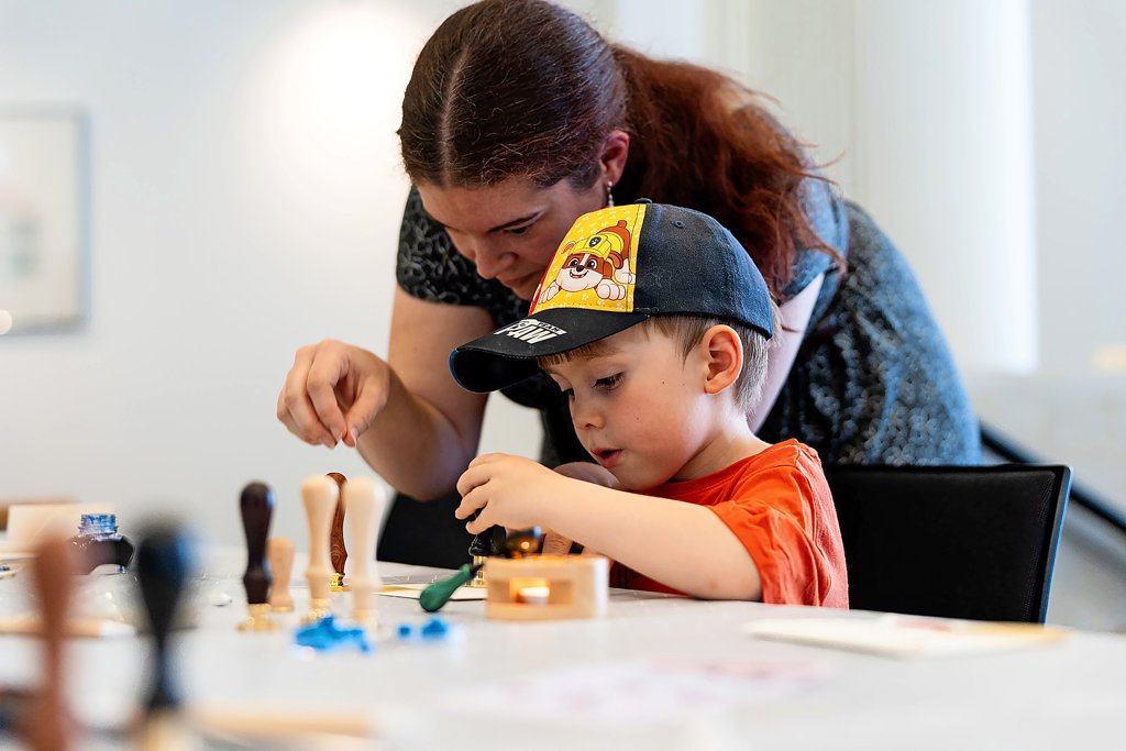 Auch zu lernen und ausprobieren gibt es beim Welterbe-Tag. In der Dombibliothek konnten sich zum Beispiel Jung und Alt an mittelalterlicher Schreib- und Siegelkunst erproben. Der vierjährige Finn Flügge drückt hier gerade den Stempel, mit Hilfe von Mutter Kathrin, ins warme Wachs. Das Team der Dombibliothek war sich vor dem Tag nicht sicher, ob das Angebot für Kinder geeignet ist. Immerhin müssen die Wachsbrocken über offenem Feuer – auch wenn es nur ein Teelicht ist – erhitzt werden. Aber allein am Samstag haben 50 Leute in 90 Minuten daran teilgenommen – ohne, dass etwas passiert ist. Foto: Clemens Heidrich