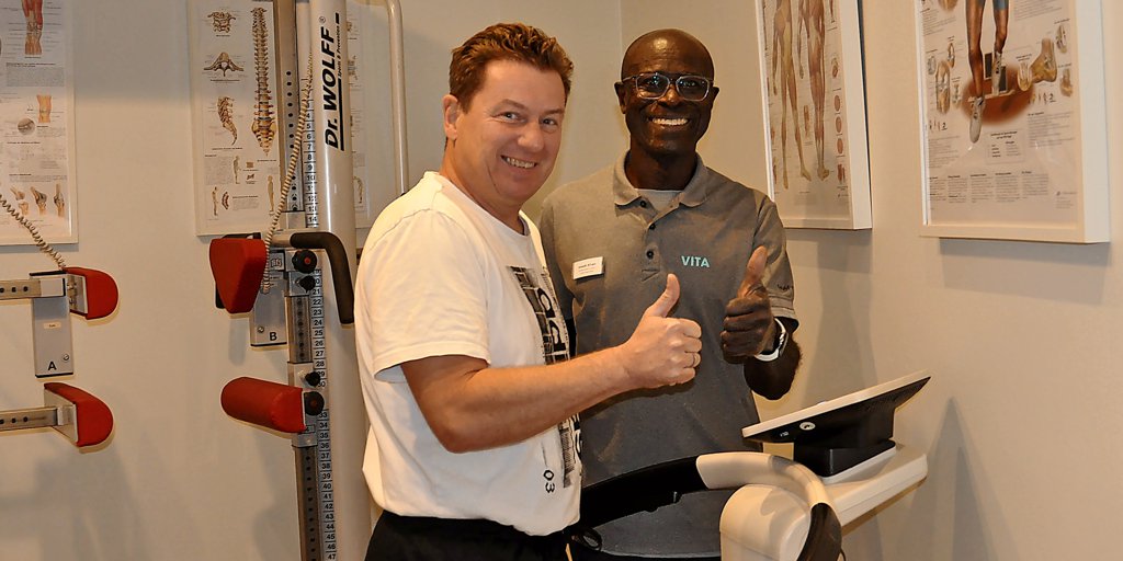 Daumen nach oben: Sportredakteur Lars Lippert und Gesundheitscoach Joseph Afram nach der Körperanalyse. Foto: Vita Gesundheit