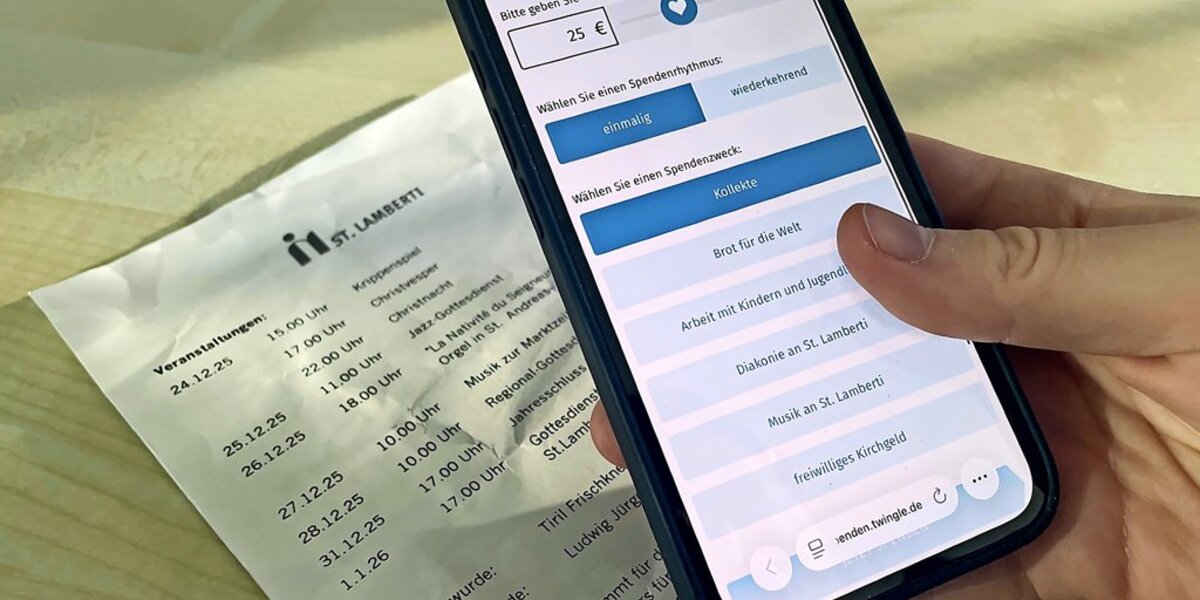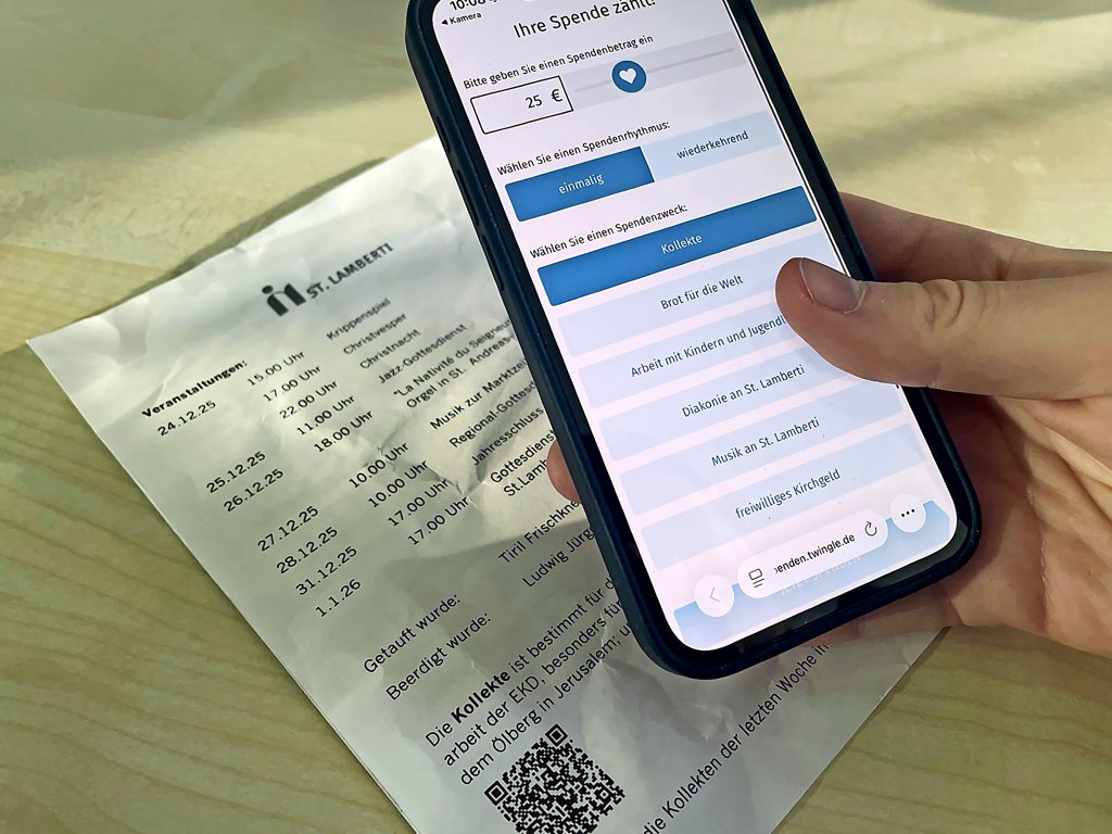 Das bestätigt auch Heidemarie Zentgraf vom Lamberti-Kirchenvorstand. „Ich hatte zunächst etwas Bedenken“, räumt sie ein. Aber Kirche müsse mit der Zeit gehen, um mit den Menschen im Dialog bleiben zu können. Dennoch wird es zwischen den Kirchenbänken in St. Lamberti klimpern, wenn der traditionelle Klingelbeutel durch die Reihen gereicht wird. So stand Zentgraf bei der Premiere auch weiterhin mit einem Körbchen am Kirchenausgang, um Spenden für die Auslandsarbeit der Evangelischen Kirche sowie für den Aufbau eines Begegnungszentrums in Jerusalem zu sammeln. Genau genommen lässt sich die Spende auch von zu Hause aus erledigen: ein kurzer Piep, ein grüner Haken – und die Sache ist erledigt.