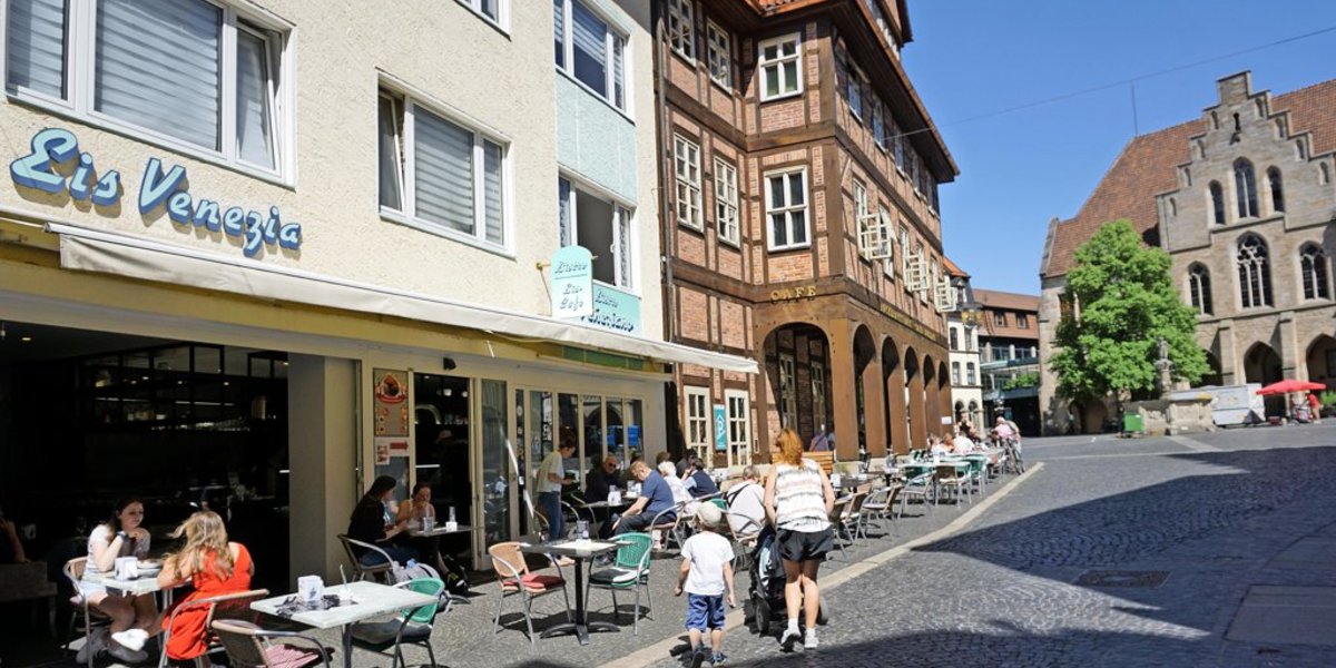 Das Eiscafé Venezia am Markt 8 ist als Ort für die ganze Familie gedacht. Laute Kinderstimmen empfindet Inhaber Salvatore Gigante nicht als störend. Im Gegenteil: „Das ist Musik in meinen Ohren.“ Mit seinen vielen Tischen auf dem Hildesheimer Marktplatz bietet das Eiscafé reichlich Platz – in der Sonne und im Schatten. Mindestens 20 Kinderwagen würden in den Außenbereich passen, schätzt Gigante. Im Café ließen sich rund sechs Karren abstellen. „Wir haben außerdem drei oder vier Kinderhochstühle.“