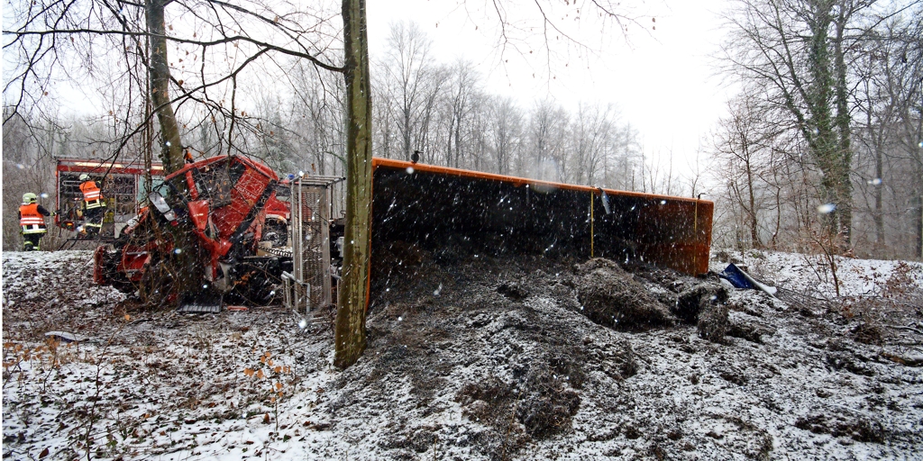 B 444 bei Nettlingen: Laster rutscht von Straße und prallt gegen Baum