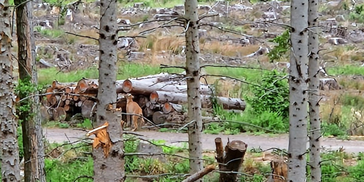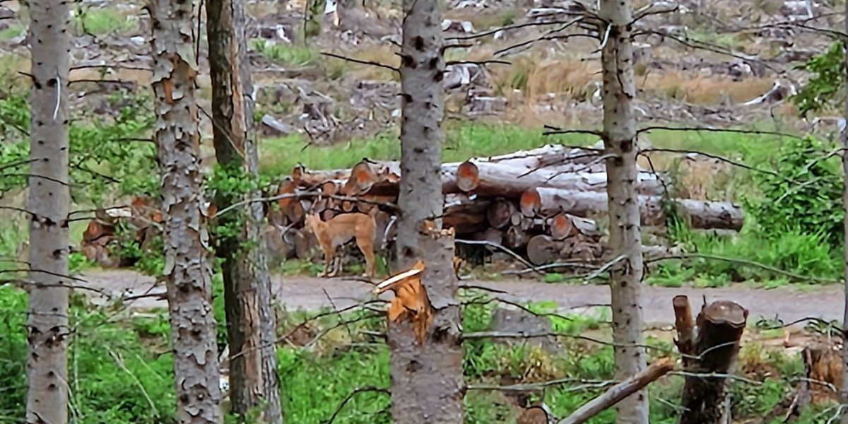 Das Exemplar, das Katrin Walkling unlängst vor der Nase hatte, war hingegen quicklebendig. Und es machte auf die Bosch-Mitarbeiterin auch nicht den Eindruck, irgendwie krank zu sein. In einer kleinen Fotostrecke hat Walkling das Verhalten des Raubtieres während der Minuten dokumentiert. Der Wind stand offenbar günstig, weshalb der scheue Räuber gar nichts davon mitbekam, dass wenige hundert Meter entfernt ein Mensch steht. Auf den Fotos ist das Tier zu sehen, wie es neugierig um sich schauend den Weg entlang streunt, gähnend an einem Holzstapel verweilt, die geschnittenen Stämme mit seinem Duft markiert und anschließend hinter dem Stapel verschwindet.
