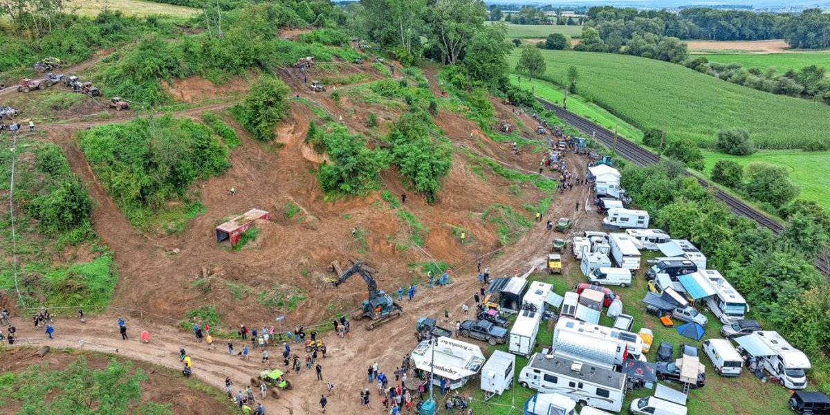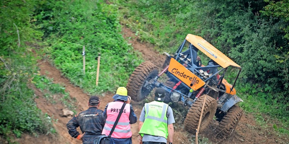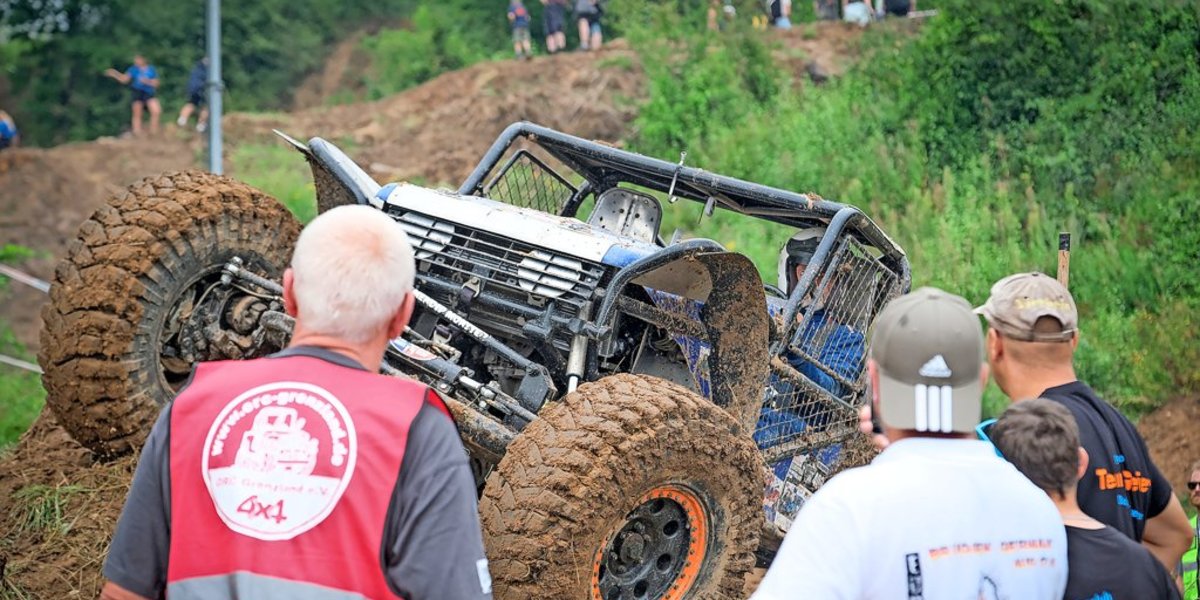 Auf der Piste gegenüber ist für einen anderen Fahrer der Wettkampf zunächst vorbei. Sein Wagen ist in einer Kurve auf die Seite gekippt. Von alleine lässt der sich auch mit Vierradantrieb und Fahrgeschick nicht mehr aufrichten. Ein Bagger, der unweit der Pisten parat steht, ist die Rettung. Er zieht das Fahrzeug aus dem Matsch, befördert es zurück auf die Strecke. Für das Team ist trotzdem Schluss. Sein Zeitfenster ist abgelaufen.
