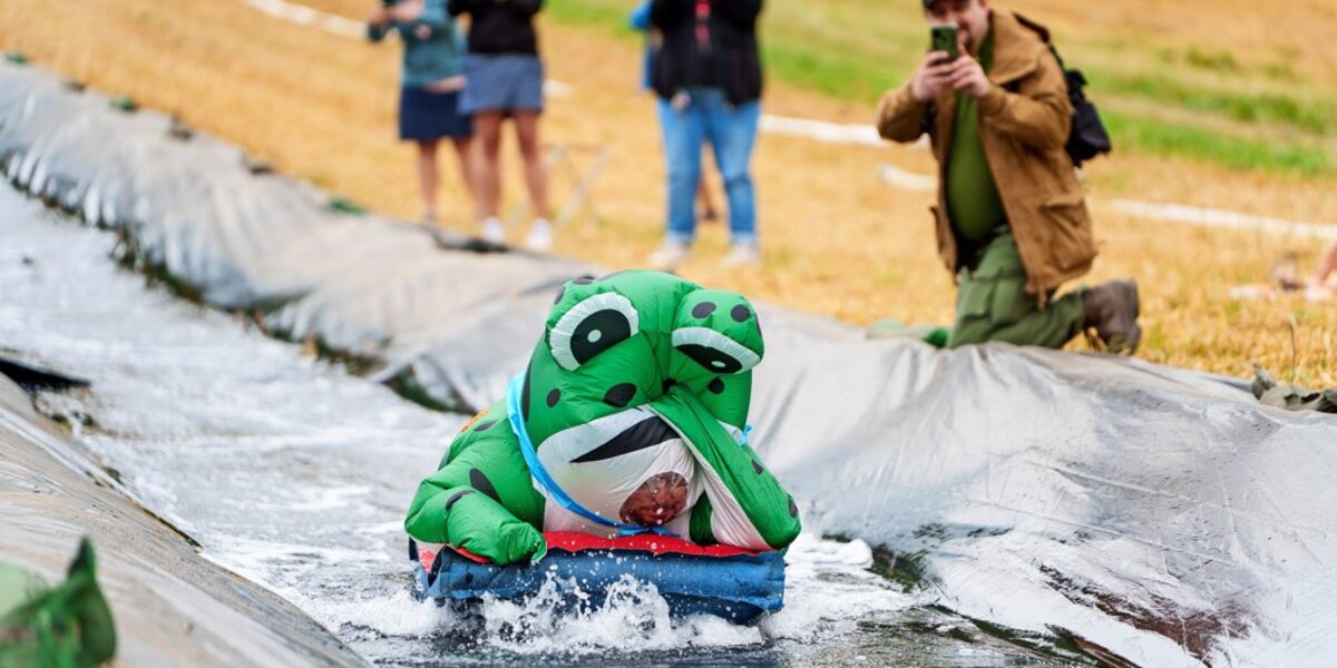 Ohne einen gewissen Höhenunterschied ist aber nicht möglich, was eine Initiative aus dem Leinebergland auf die Beine gestellt hat. Vom Waldrand auf dem Külf bis hinunter an den Ortsrand haben die rund 50 Helfer eine etwa 250 Meter lange Wasserrutsche installiert – als größte Attraktion eines Treffens von Menschen aus ganz Deutschland und mehreren Nachbarländern, die eigentlich die Liebe zum Geocaching eint. Für den Lauf des Wochenendes haben sich sogar Gleichgesinnte aus den USA und Kanada angekündigt, die gerade auf Europareise sind.