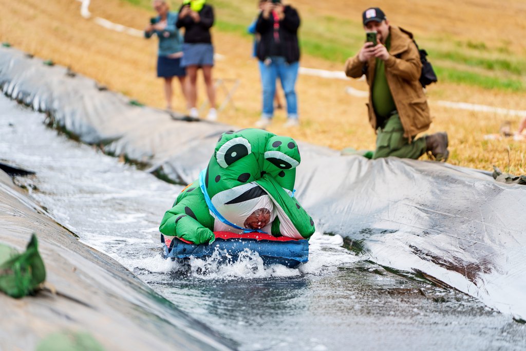 Das beginnt mit dem Deinser Landwirt Martin Mundhenke, in Geocaching-Kreisen bekannt als „Der Külftaler“. Er hat vor gut zwei Wochen noch schnell den Weizen abgeerntet – womit der Weg für einen befreundeten Baggerfahrer frei war. Der baggerte die Fahrrinne aus. Darin wurde zunächst ein Rübenvlies verlegt, dann kamen dicke Gummiplanen darüber. Zwei Pumpen – beide fallen zum Start aus, können aber schnell repariert werden – sorgen dafür, dass das Wasser aus dem Auffangbecken am Fuß der Strecke mithilfe von Feuerwehrschläuchen wieder nach oben transportiert wird.