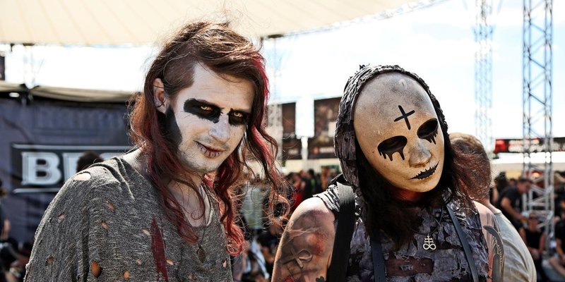 Für das Line-Up kommen Carsten und Sören (von links) nicht, sondern für die Leute. Carsten kommt aus Kiel und arbeitet im Landhandel, Sören ist Gymnasiallehrer im Heidekreis. Sie kennen sich über eine Freundin. Ja, einige von seiner Schülern wüssten von seiner Leidenschaft, gesteht Sören. Aber Thema sei das nie. Auch Carsten sitzt im Alltag ganz bürgerlich in Anzug und mit Brille am Schreibtisch. Auf dem M'era Luna können sich die beiden Horror-Fans austoben. Gestern seien sie aber ganz aufgeräumt unterwegs gewesen, verraten sie. Foto: Julia Moras