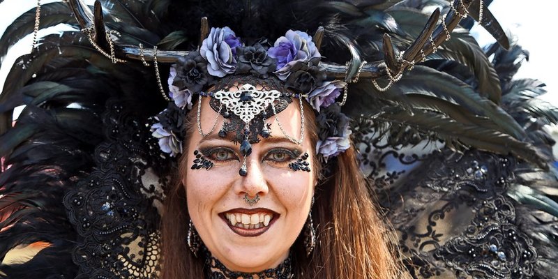 Sphaera Obscura misst auf dem M'era Luna 2,03 Meter. Schon ohne Absätze ist das Modell nämlich 1,83 Meter groß. Die Schuhe wird die Dortmunderin bis zum Abend nicht ausziehen. "Mit genug Übung und Tape ist das kein Problem", erklärt sie. Notfalls ist Freund Dorian stets an ihrer Seite. Foto: Julia Moras