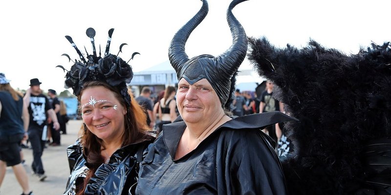 Yvonne kommt seit 2004, Katy immerhin seit 2015 aufs M'era Luna. Die Freundinnen kommen aus Magdeburg hierher und freuen sich, passend zum Outfit, auf Blutengel und ASP. Dass die beiden etwas älter sind als die typischen Festivalgäste, störe hier nicht. "Hier sind viele sogar noch älter als wir, das ist das schöne am M'era." Übrigens: Die Flügel von Katy wiegen vier Kilo. Foto: Julia Moras